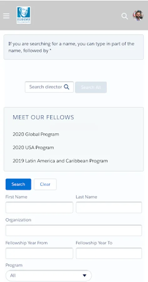 The Directory of Fellows is the official database for the Eisenhower Fellowships Network. The EF community can search for Fellow contact and biographical information and collaborate on projects virtually. Current Fellows can access meeting schedule details. Other users can see public information about Eisenhower Fellows.