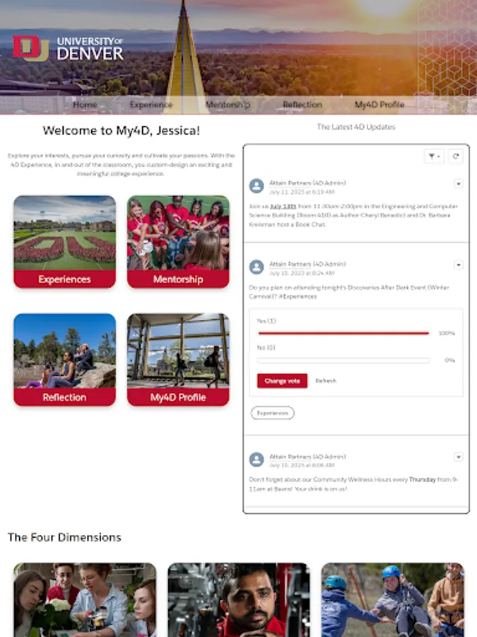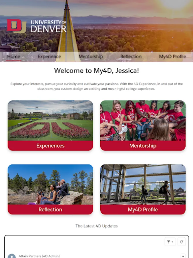 The 4D Experience is how the University of Denver is going far beyond the world’s expectations of higher education today. You as a student have distinct needs, desires, values and ways to shape the world and contribute to change. The 4D Experience is how we help you reach your potential and support you on your journey. Get started now through the My4D app.