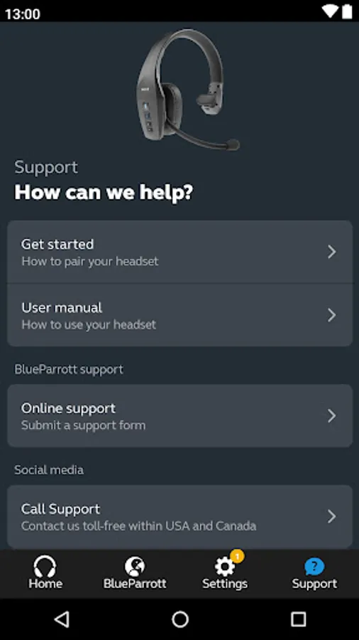 Get started and access support when you need it. Instructions help you to easily pair your BlueParrott headset and smartphone quickly. The app also offers instant access to user guides and the BlueParrott technical support team when you need assistance.