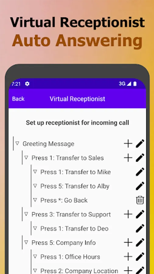 - Virtual receptionist: automated answers for calls and press x to redirect