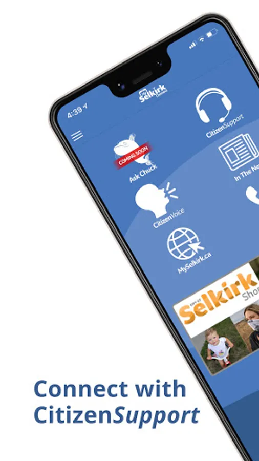 With the MySelkirk Connect app, you can contact our CitizenSupport representatives, find the answers to your questions and stay connected to the latest news about your city.