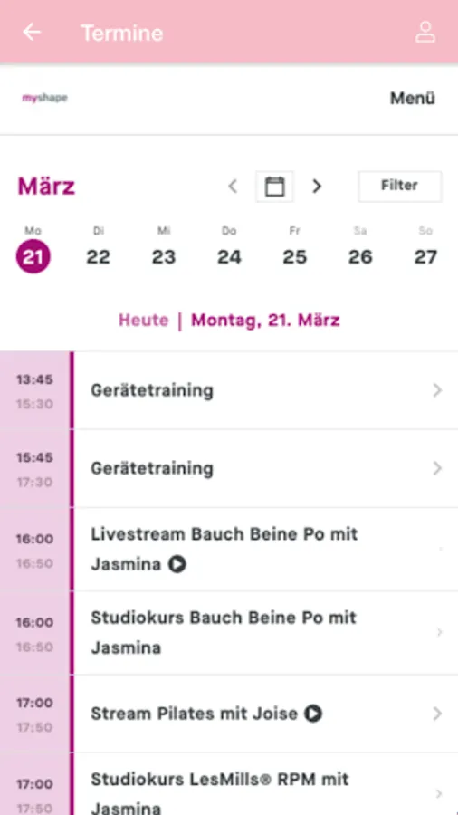 With the myshape app, as a member, you can now choose your courses quickly and easily. Be it for a cardio workout, for a LesMills class, for a live stream at home or for your personal device training.