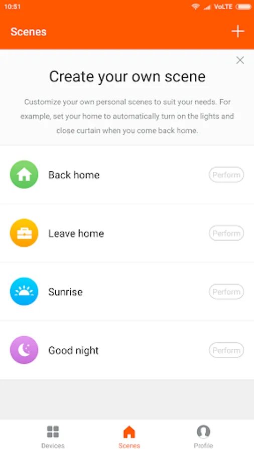 • Pre-programed scenes: Back home, Leave home, Sunrise, Good night