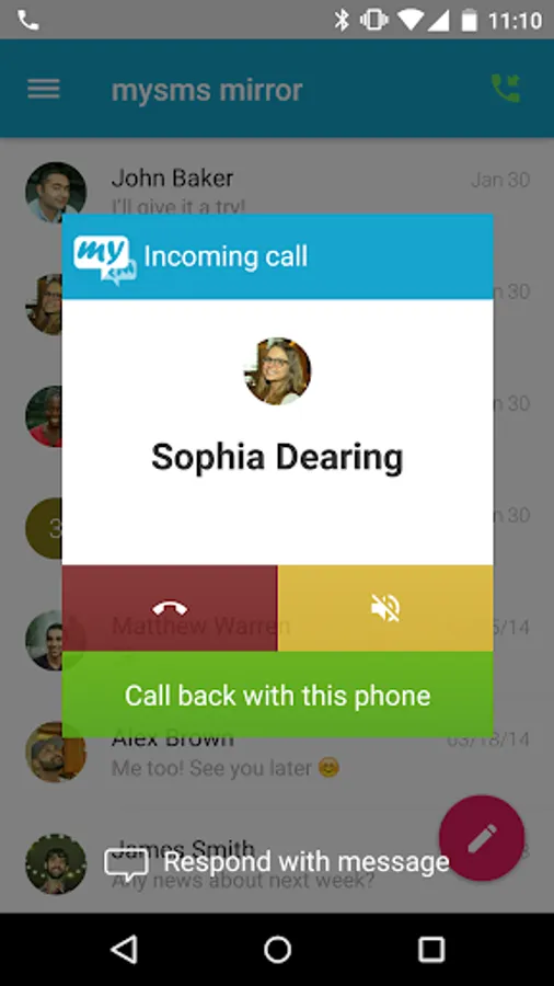 mysms mirror is a handy SMS extension for everyone who uses two or more smartphones. The mysms mirror app receives all your SMS, calls and contacts from your first other phone. No missed texts, no missed calls, no worries which phone to take. It will feel like you have your other phone with you, even if you leave it at home/at the office.