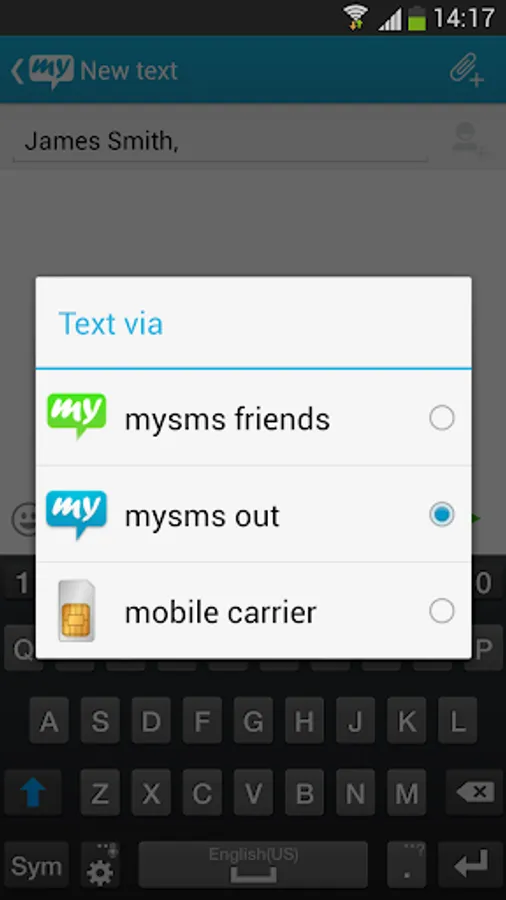 With mysms out you can send domestic and international SMS for only € 0.08 (UK: £0.07). Your mobile phone number is displayed as the sender (provided that it is supported by your contact's mobile carrier).