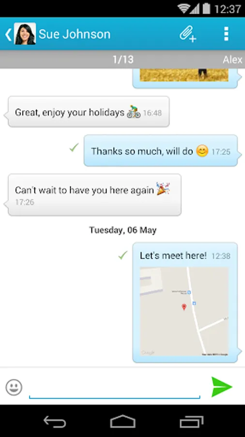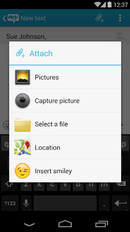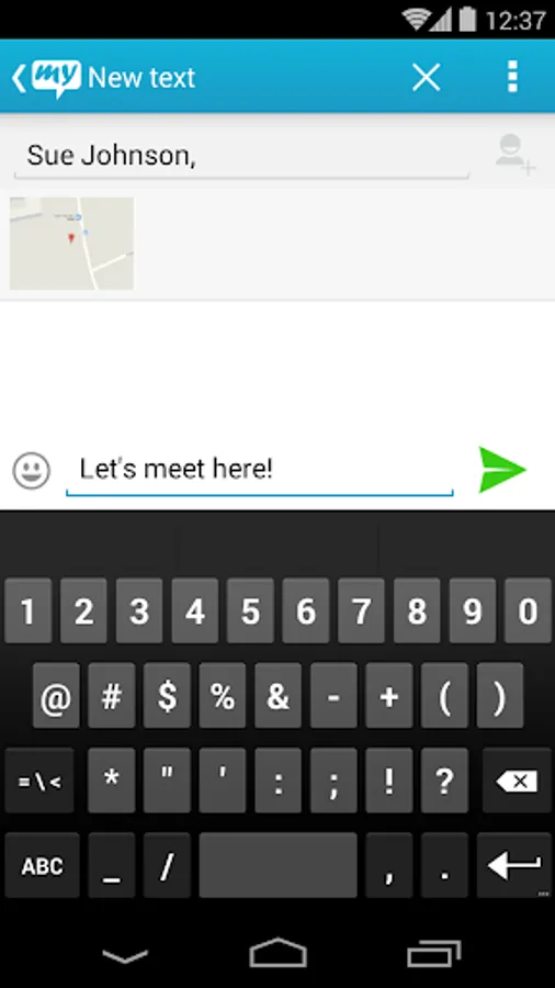 3) Now you’re ready to share your location via the mysms phone app (New message – Add attachment – Location)