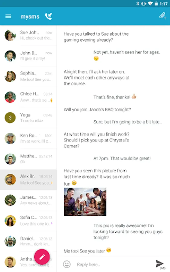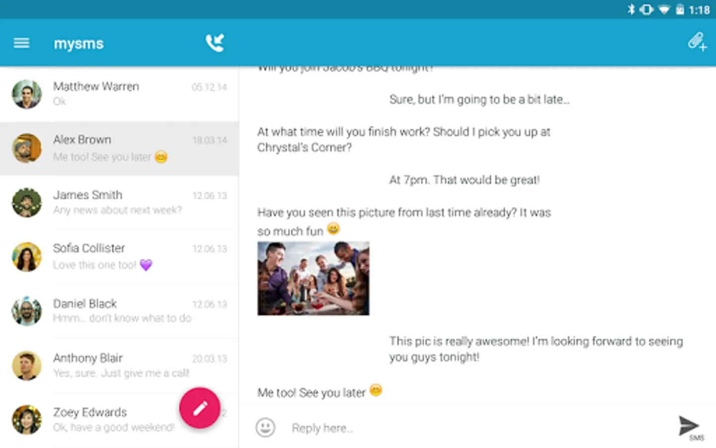 mysms enables you to manage your Android SMS notifications on your computer and tablet. You also have the choice to use mysms as default SMS app on your Android phone offering you great customization options, expandable notifications and many more features that your preinstalled stock SMS app cannot beat.