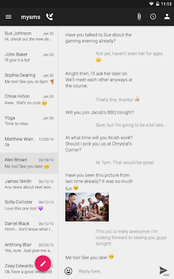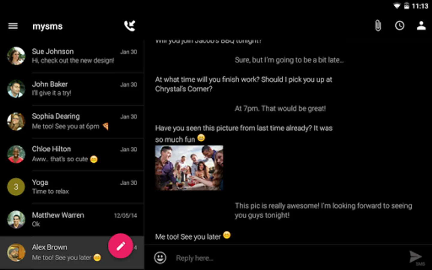 Leave your phone in your pocket and send/receive SMS text messages on your tablet. Your SMS inbox is synced with your phone.