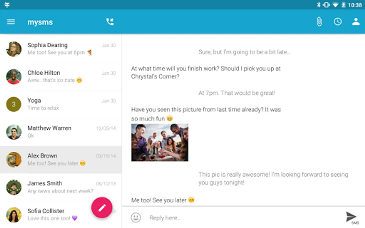 mysms is not only a great SMS texting app, you can even make voice calls on your tablet (Bluetooth headset required). Dial on your tablet, talk on your phone.*