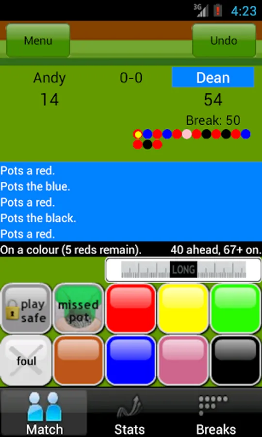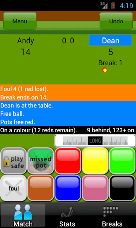 - the app knows all the rules - respots, foul and a miss, multiple reds in one shot, re-racks, skip the last black when the frame is already won, concede or end frame early - but with the flexibility to record every eventuality.