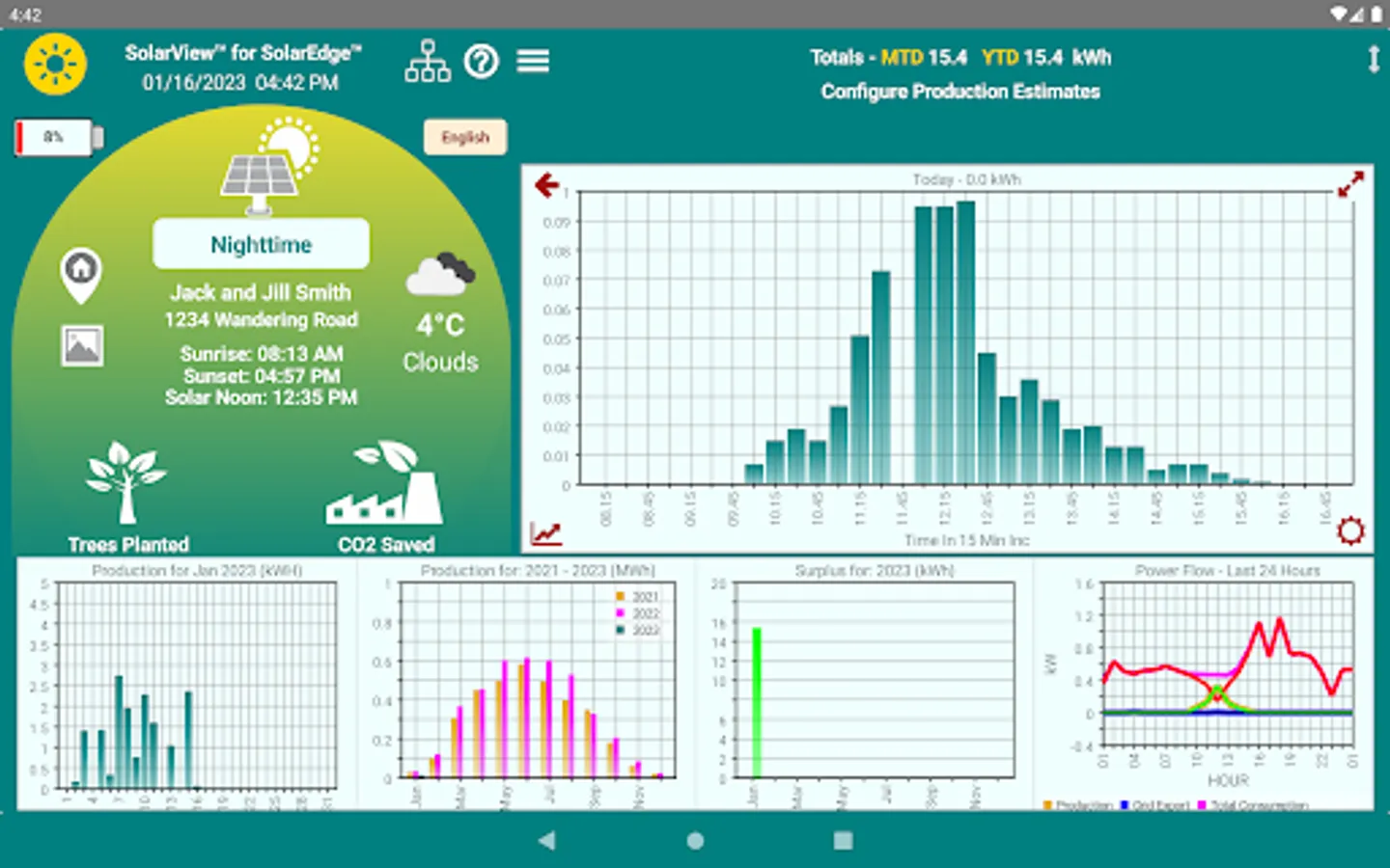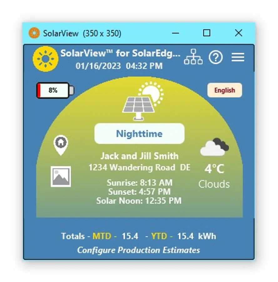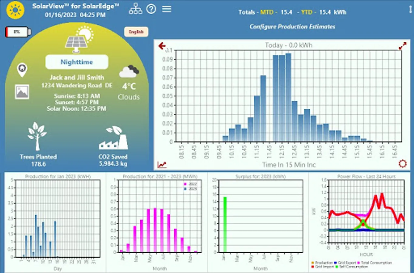 SolarView has many key features found nowhere else for SolarEdge-based solar energy systems. Even in the free version, SolarView provides all the core information you need on a single screen with no scrolling or navigating needed and it refreshes to the most recent data as soon as you open it. With upgraded licensing, SolarView provides continual analysis of your surplus or deficit energy production compared to the estimates or promises made by your solar company, allowing you to keep them honest. SolarView offers side-by-side comparison of production for any two selected years so you can track how your production is impacted by aging, debris, or other issues.