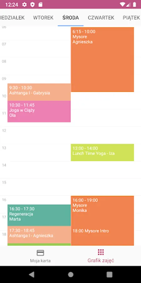 We offer classes for beginners such as Beginners class (introductory basics of yoga), Regeneration (gentle classes) and Happy Spine classes (to help get rid of the pain and stiffness of the spine), for the intermediate or advanced we offer Ashtanga classes. A unique form of Mysore classes (individual practice guided by the teacher) is suitable for both beginners and advanced.