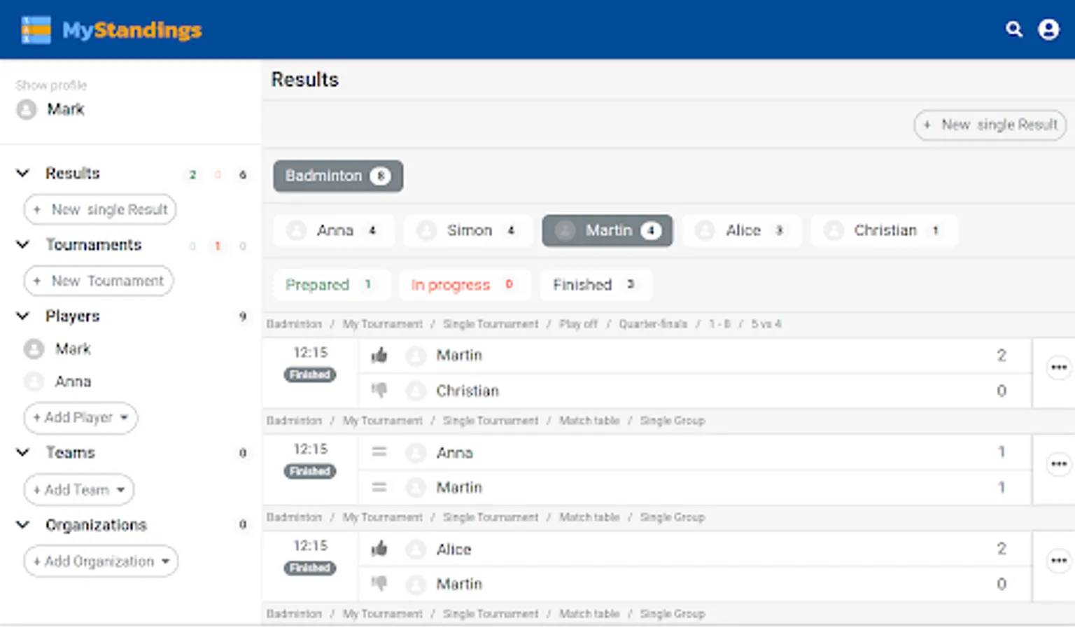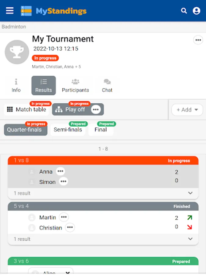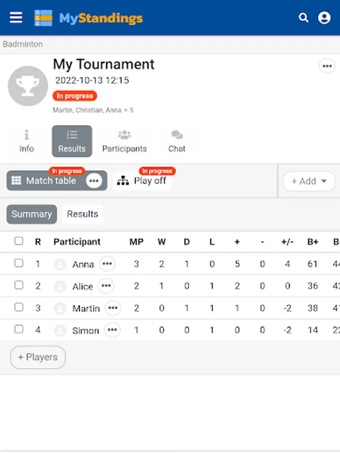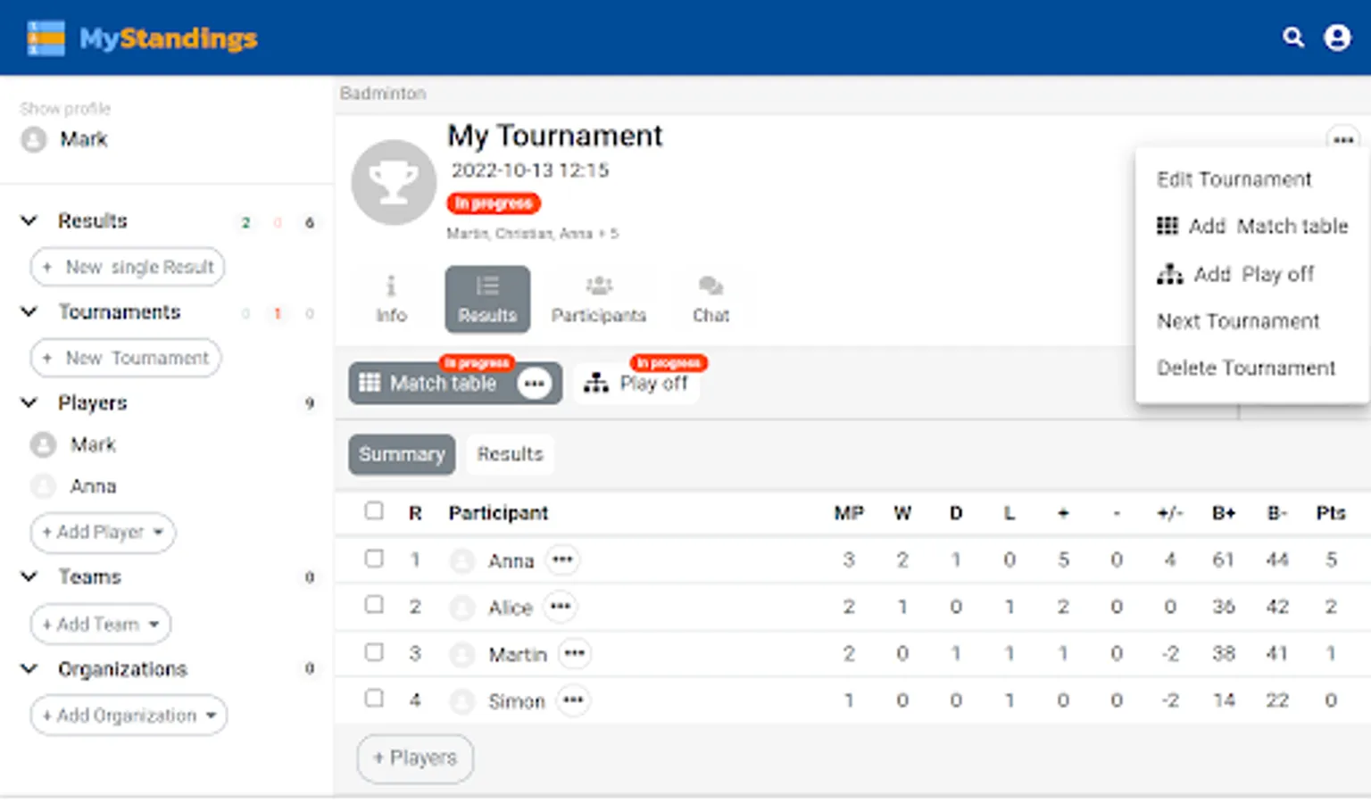 Create and organize your own tournament with friends, colleagues or classmates. A tournament can have multiple stages or seasons.