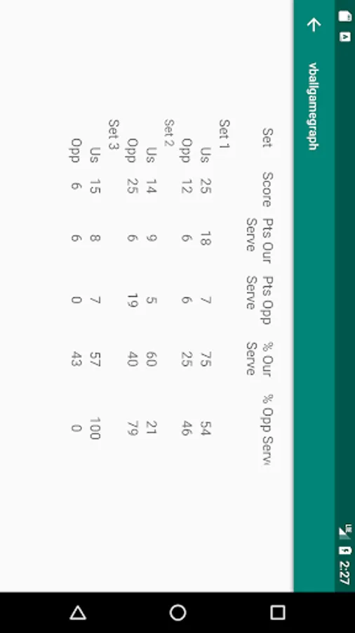 View Totals screen which includes: Score per Set, Serves per Set, Points on our Serves, Points on Opponent Serves, % points on our Serves, % points on Opponent Serves