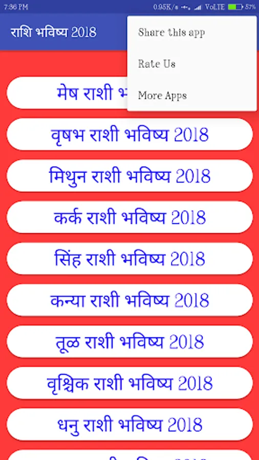 यह आवेदन राशी भविष्य (मराठी में राशी भव्य) वैदिक ज्योतिष के सिद्धांतों पर आधारित है। हमारा "मराठी राशी भाव" आपको बताता है कि प्यार, परिवार, वित्त, सफलता और समृद्धि इत्यादि जैसे विभिन्न दृष्टिकोणों से प्रत्येक दिन आपके लिए कैसे होगा। यहां दिए गए मराठी में दैनिक कुंडली आपको दिन और मदद के लिए बेहतर तैयार करने में मदद करेगी आप इससे अधिक लाभ उठाते हैं। दैनिक मराठी कुंडली के अलावा, वार्षिक कुंडली अर्थात मराठी में राशी भव्य 2019 सभी राशि चक्रों के लिए भी उपलब्ध है। आप पोथोल से बचने और कठिनाइयों के बिना पथ को चलाने के लिए मराठी में आज के कुंडली को पढ़ सकते हैं। यहां दिया गया आज का मराठी कुंडली हमारे अजीब ज्योतिषियों द्वारा हर दिन ज्योतिषीय सुझाव देने के लिए तैयार की जाती है।