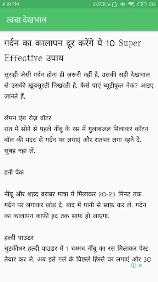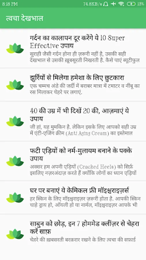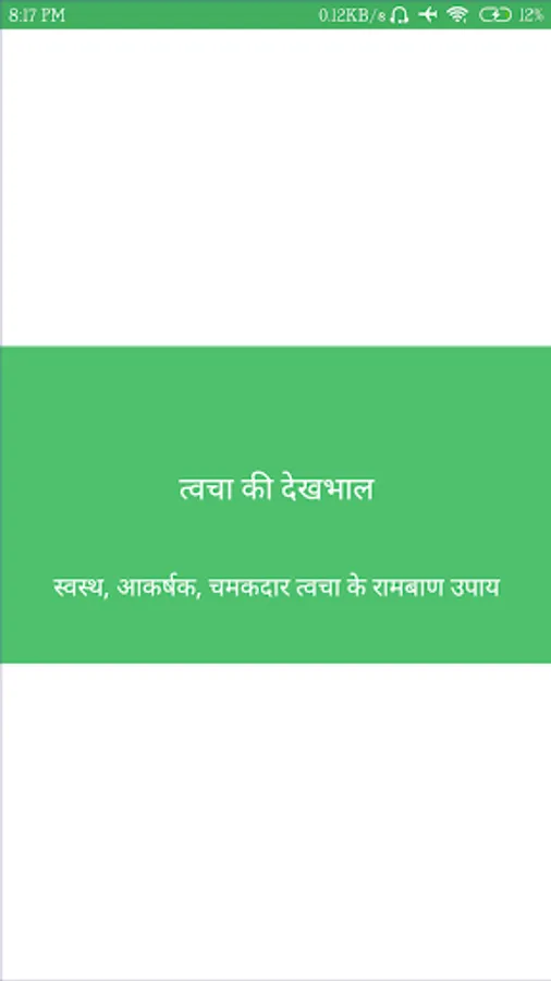 Skin Care in Hindi-त्वचा देखभालयह ऐप शुष्क त्वचा, तेल त्वचा, सामान्य त्वचा, बाल और अन्य प्राकृतिक उपचार के लिए घर का बना सौंदर्य सुझावों के बारे में है।