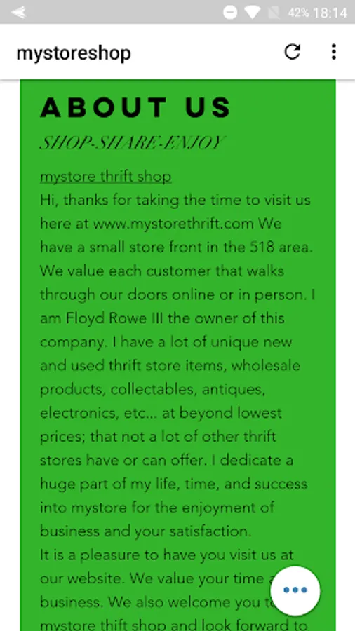 Hi, thanks for taking the time to visit us here at www.mystorethrift.com We have a small store front in the 518 area. We value each customer that walks through our doors online or in person. I am Floyd Rowe III the owner of this company. I have a lot of unique new and used thrift store items, wholesale products, collectables, antiques, electronics, etc... at beyond lowest prices; that not a lot of other thrift stores have or can offer. I dedicate a huge part of my life, time, and success into mystore for the enjoyment of business and your satisfaction.