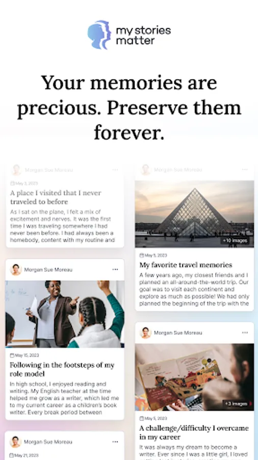 • [Privacy] is our #1 priority. We don’t share your data to third parties and we certainly do not sell your data. We at My Stories Matter have our own memories, childhood photos, family vacations, and life advice stored on the app as well. We don’t want our stories and wisdom sold to the highest bidder and we know that you don’t either.