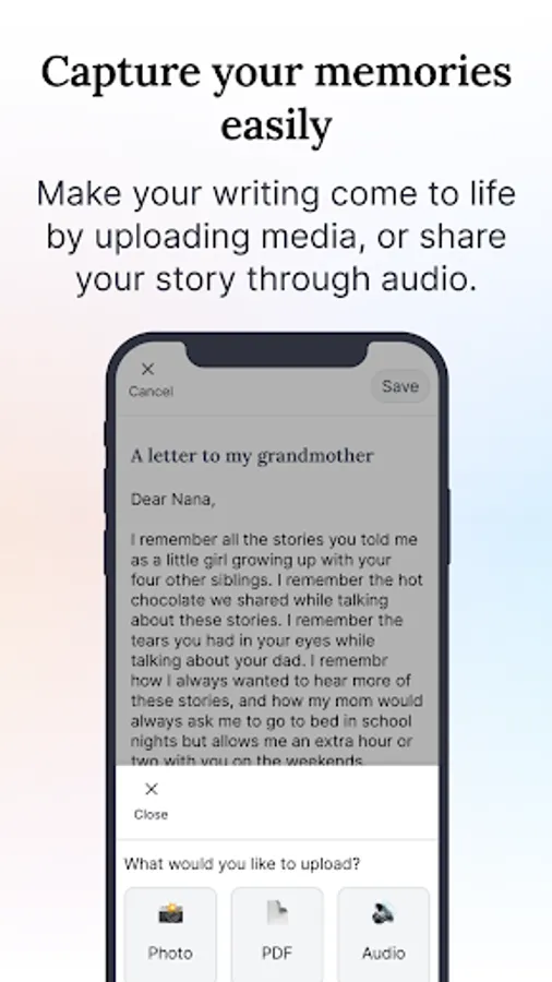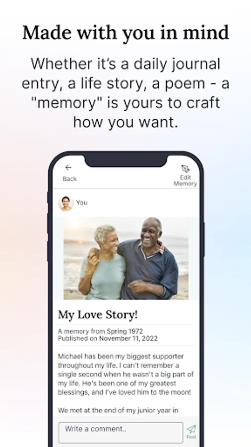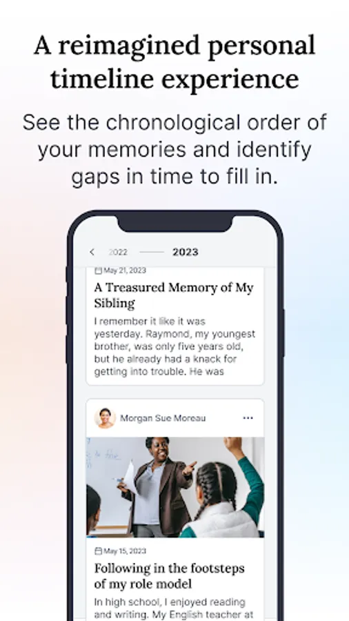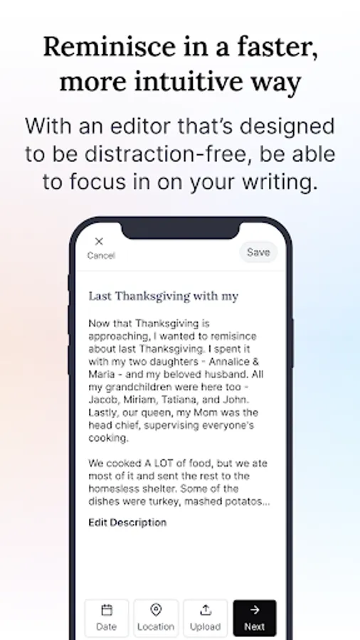Built in consultation with psychology professors, we leverage the latest academic research on reminiscing, nostalgia, and memory recall to help you remember and record memories to enrich your life as well as the lives of your loved ones.