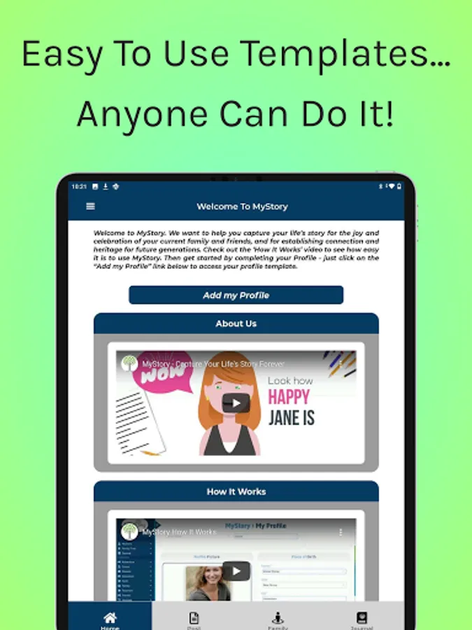 This early version of MyStory offers the basic functionality of the platform; create your profile, post storylines capturing your life’s story, create your family tree, and for those who journal, capture your entries online.