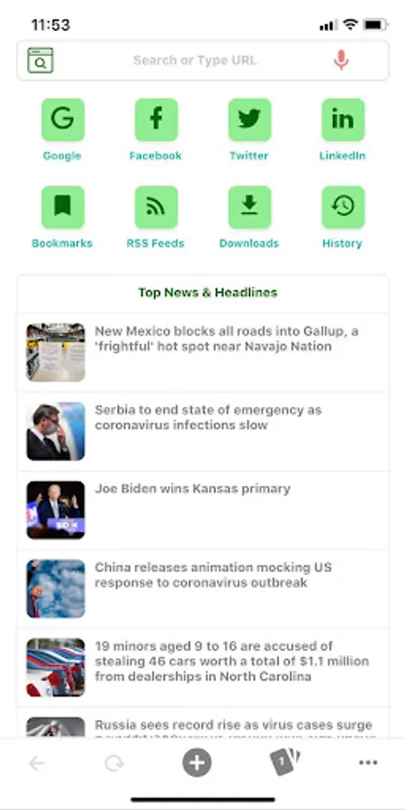 Our built-in default search that is customized to your location and does not require any redefinition what so ever. in our home page - see your most-visited websites with shortcut, Start a web search and catch the latest news items.