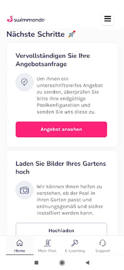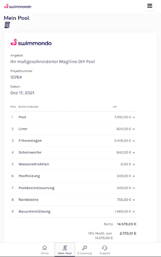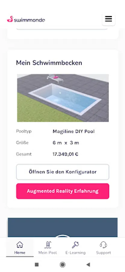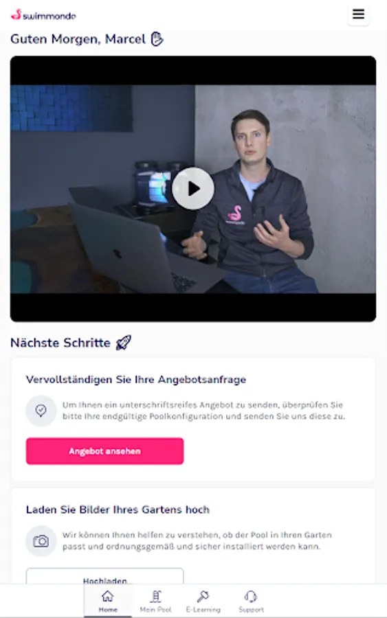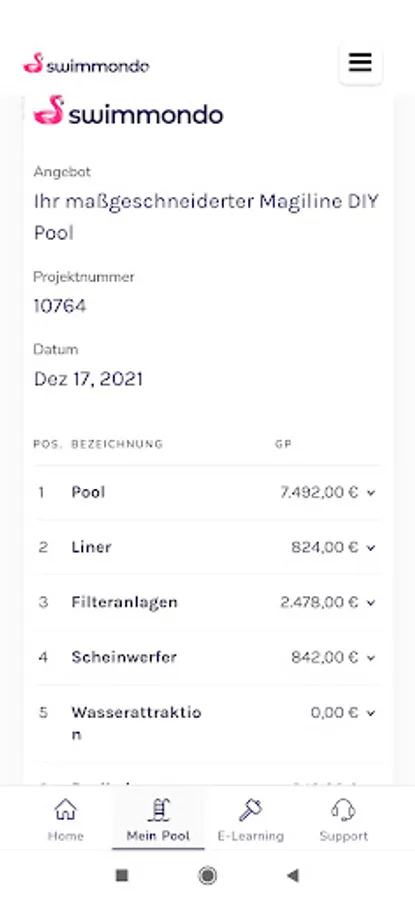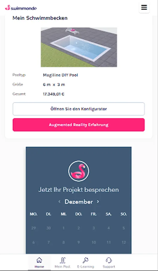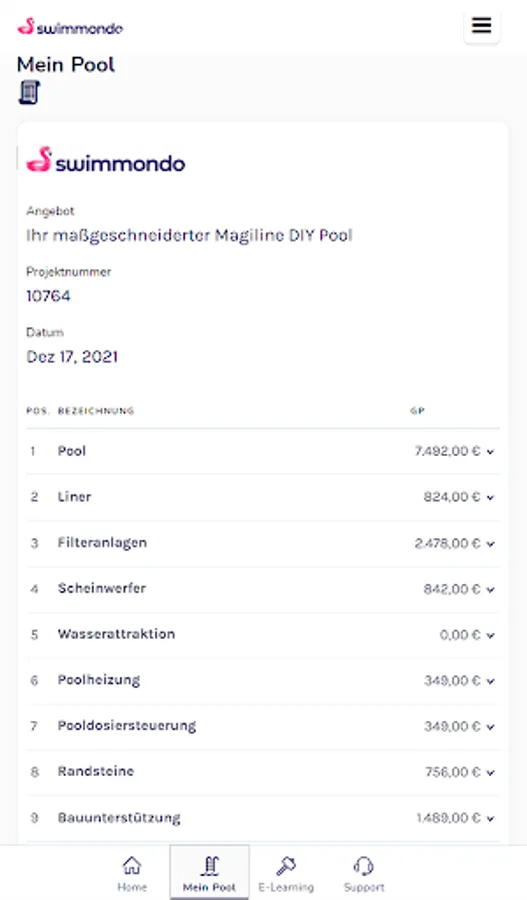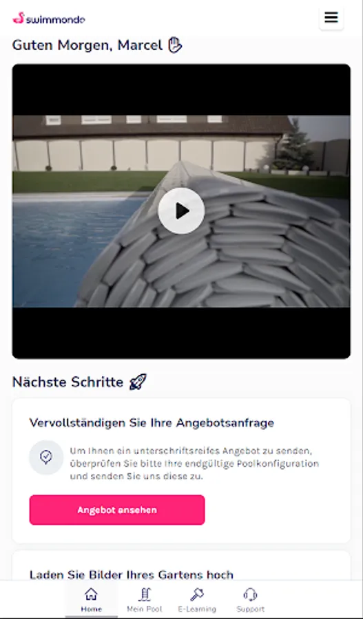 With the MySwimmondo app we accompany you on the way to your own pool oasis. From your pool configuration to the completion of your pool construction, the app offers you a transparent and up-to-date overview of all relevant information about your pool project.