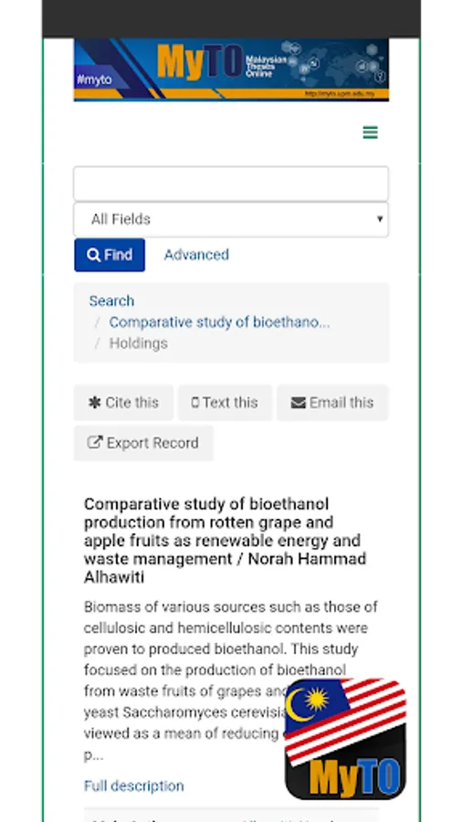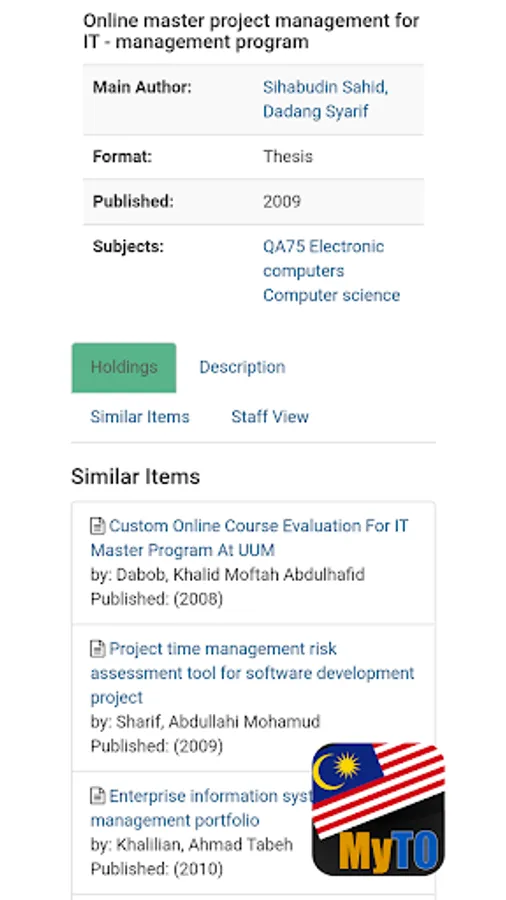 MyTO is an electronic theses dissertation (ETD) initiative to manage the collection of theses and dissertations of public and private universities in Malaysia. MyTO was established at the end of 2005 to be a central repository of Malaysian theses and to share the collection of theses between academic libraries in Malaysia electronically. MyTO provides easy access and retrieval through search engines that retrieve accurate search results by simple search, combination of Boolean operators, full-text search and provide the browsing feature. MyTO also provides several format of theses access for the user such as abstract, 24 pages full-text and complete full-text.