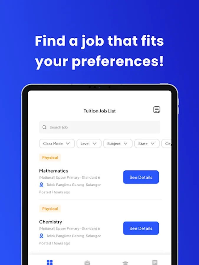 Dapatkan kelas di rumah secara fizikal mahupun online bersama tutor terbaik mengikut keperluan anak-anak anda dan sesuai dengan bajet anda.
