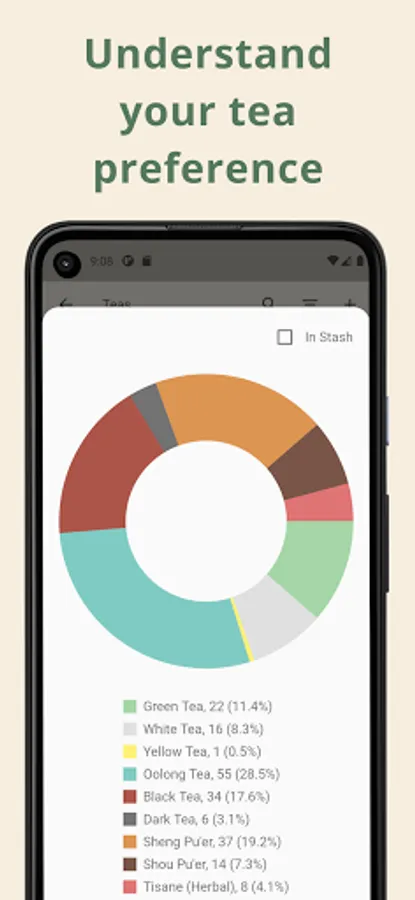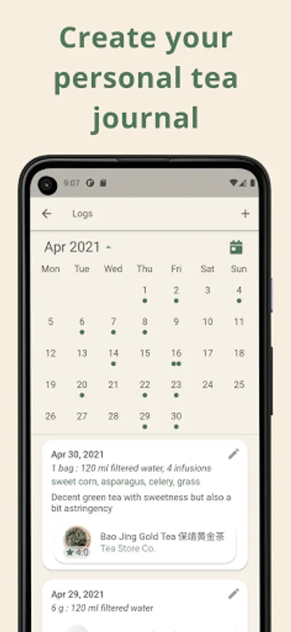 • Visualize Stats: See your logs in a calendar and teas in a pie chart