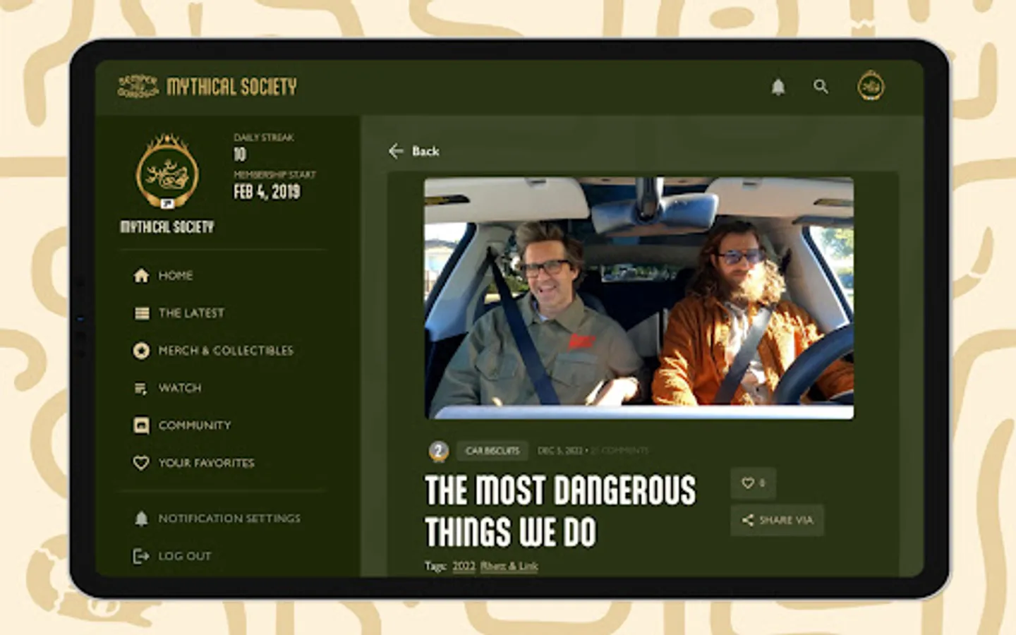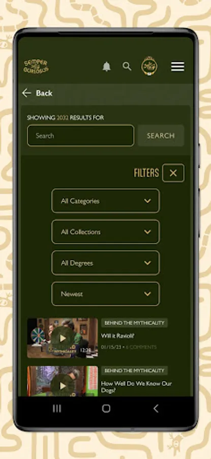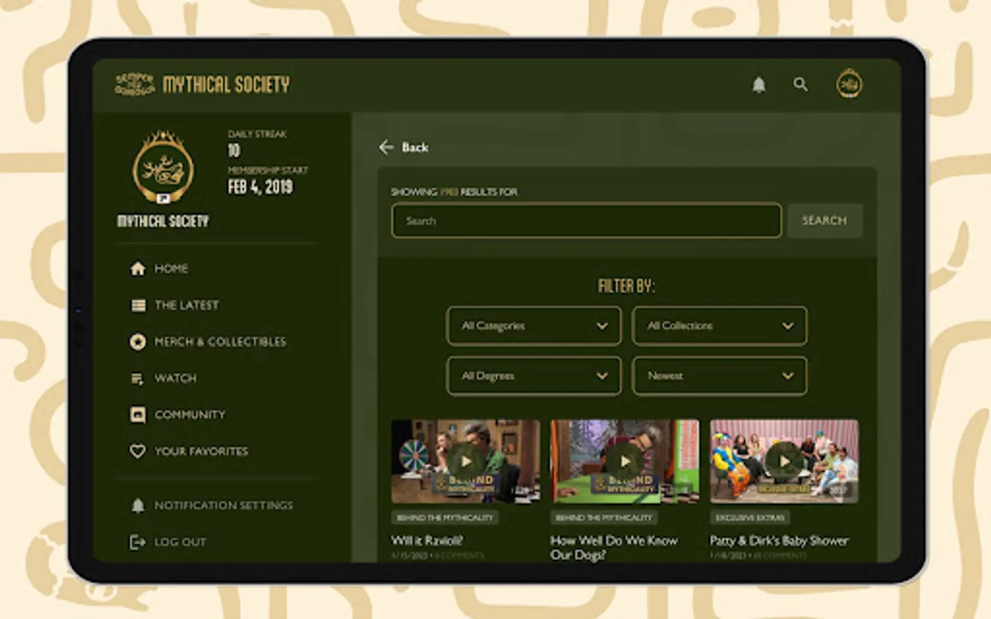 Enjoy the perks of the new Mythical Society App! Members can watch and cast their favorite content, search our vast video library including filtering by Degree access, and customize their experience by adding favorites. Creating, editing, and deleting comments is streamlined, notifications are much improved & relevant, and members can compete with app visitation stats!