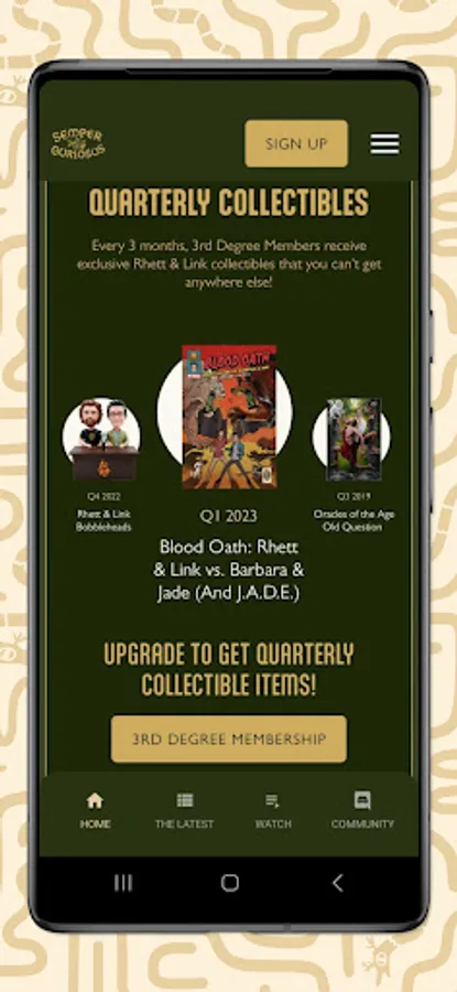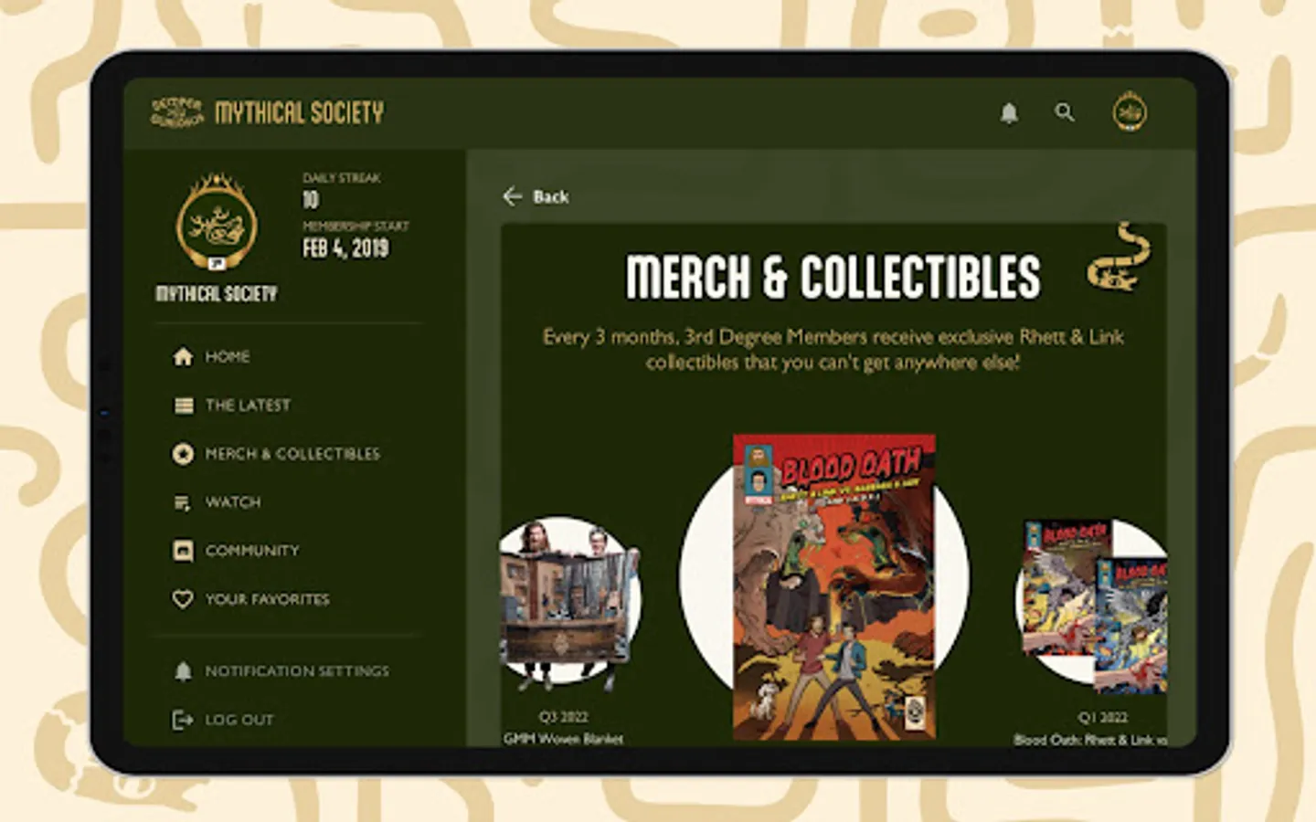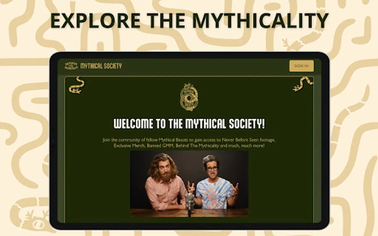 The Mythical Society offers an array of benefits not available anywhere else, including livestreams and AMAs with Rhett & Link, bonus content and additional footage from Good Mythical Morning, weekly video content, original series, insider leaks and sneak peeks, surprise prop giveaways, discounts to the Mythical Store as well as Mythical Society-only merchandise, early access to tickets for live events, a private members-only Discord server, and unique quarterly signature-series collectibles.