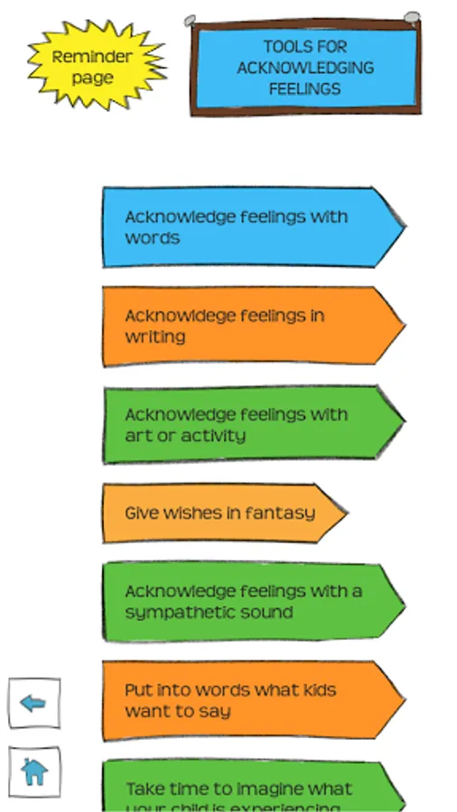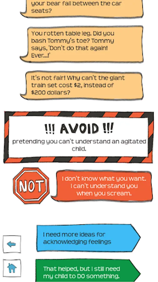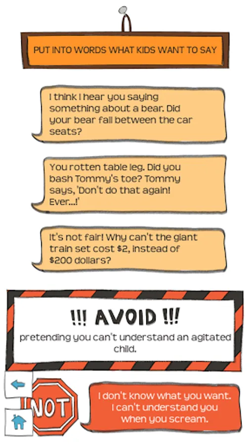 Are you worn out by sibling strife, bedtime battles, food fights, and clean up conflicts? Are you tired of tantrums and meltdowns? Do you wish you had a button to press that would make kids just behave? We provide the buttons! Users choose from the following categories and click through questions that guide them to instant tips and advice.