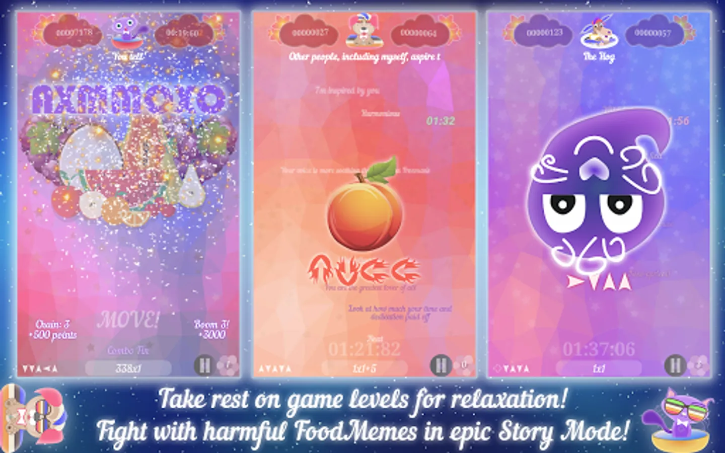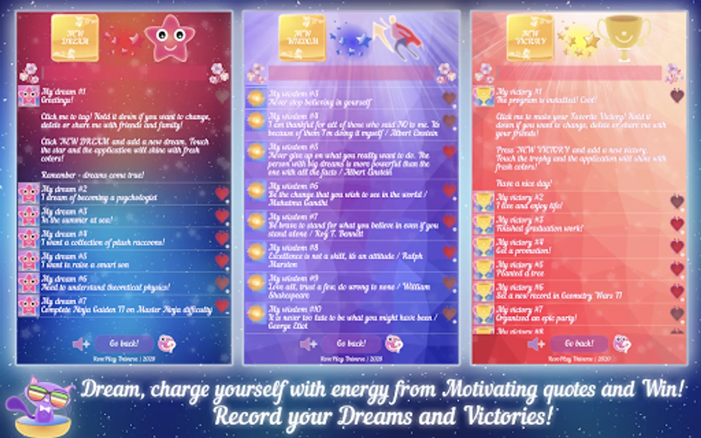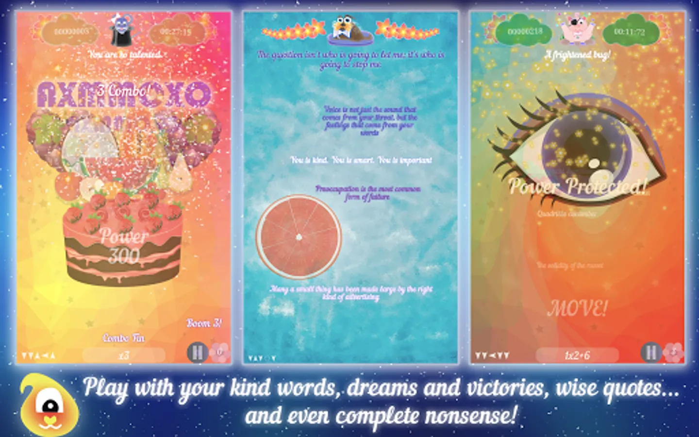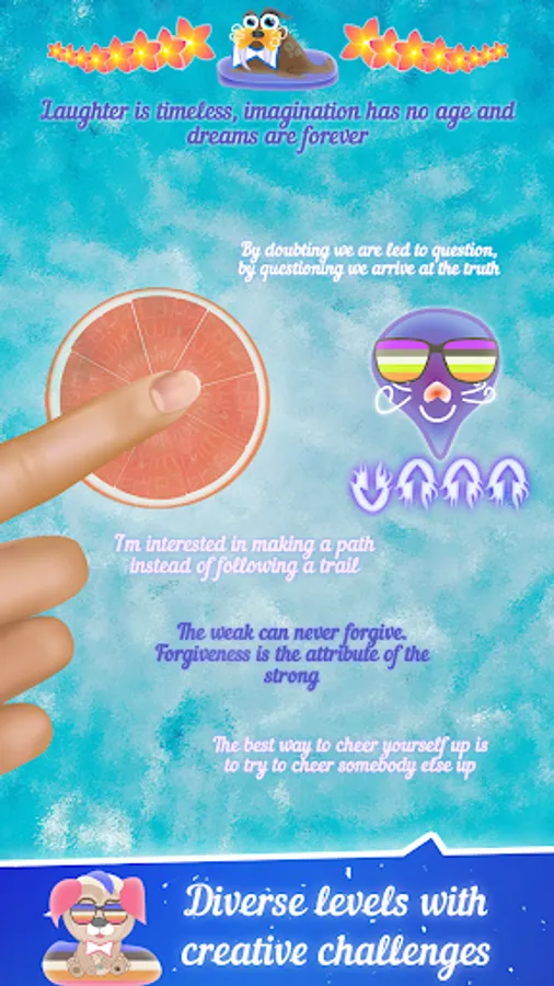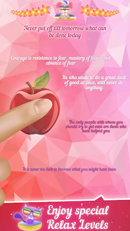 One half of the levels is designed to relieve stress and improve mood. Just move your finger across the screen and get warm words, inspirational quotes and reminders of your dreams and achievements!