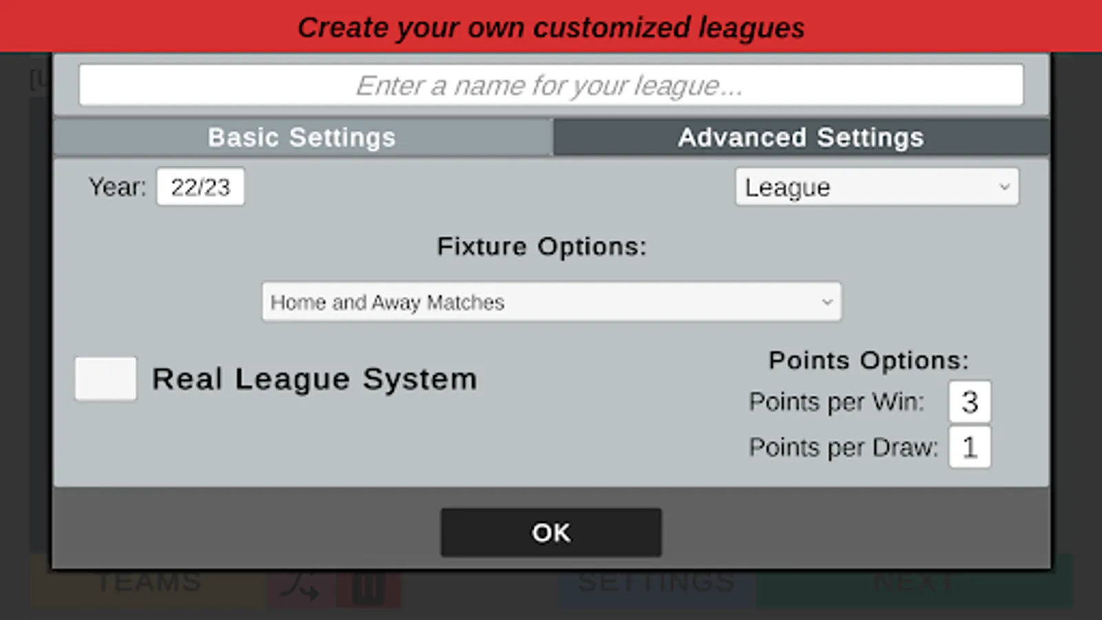 With our new Real League System, you will be able to simulate a set of leagues just like in real life, with your own customized teams and settings. Real League Systems aim to simulate promotion and relegation between leagues, you will be able to create and manage any leagues you want, no matter where you are from! Not only that, but all of the previous result years of your league tables are saved, meaning you can go back and check your league history from the beginning.