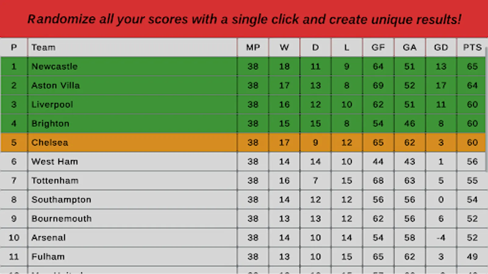 Our fixture system has been vastly improved to simulate realistic home and away matches, making them more evenly spread. You can also randomize all the fixtures to generate unique results! We have also improved a lot on our loading and saving systems, as well as our color management system! We have also reintroduced a complete makeover of our Top Scorers tab from the previous version.