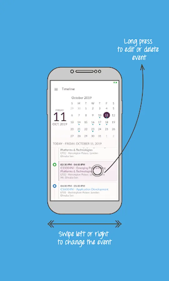 Timeline is an android app for managing and scheduling events. App user can easily manage and schedule the events. Schedule event will be notified on specific time.