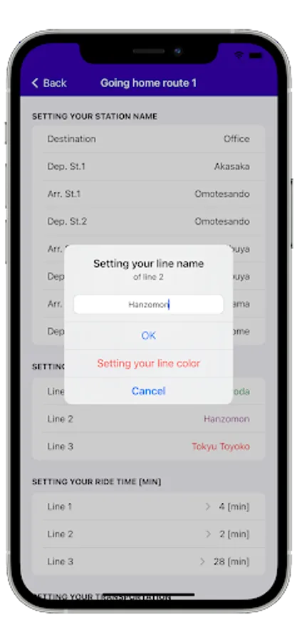 2-5) Tap "Line1" and enter your line name. If necessary, set up "Line2" and "Line3" in the same way. Also tap "LINE COLOR SETTINGS" to change the line color.