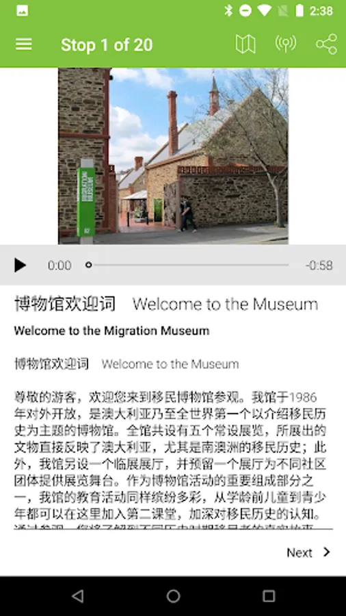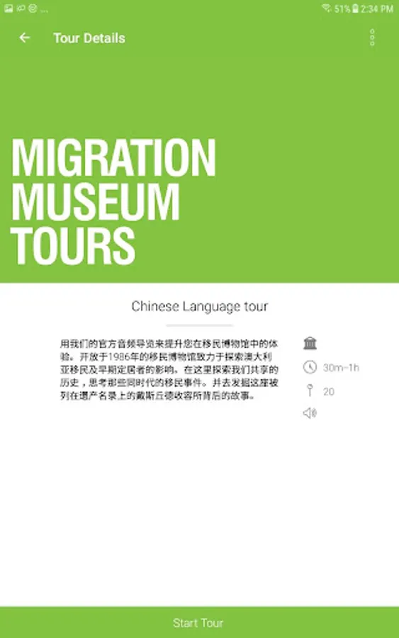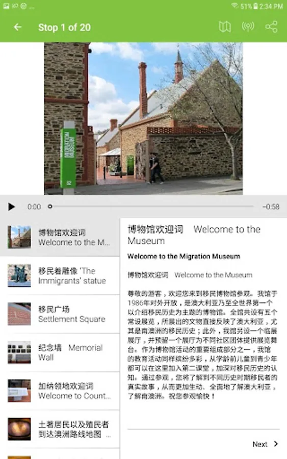 A museum audio tour app introducing visitors to the South Australian Migration Museum and some of its main themes. The app includes a Chinese language walking tour complete with audio and imagery. New themed audio tours will be developed and added to the app periodically.