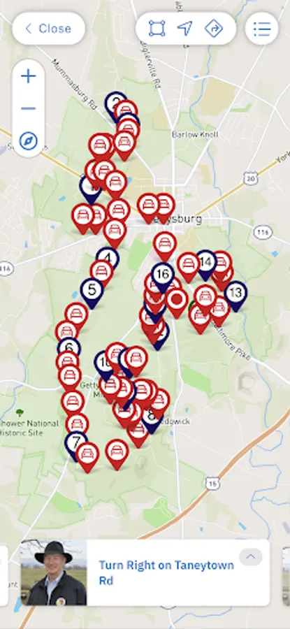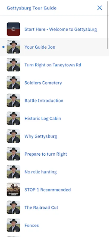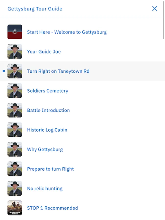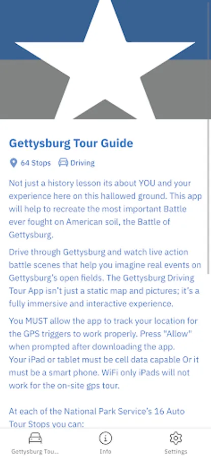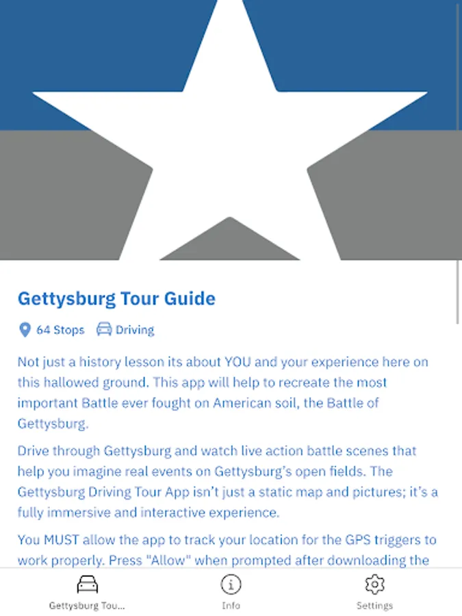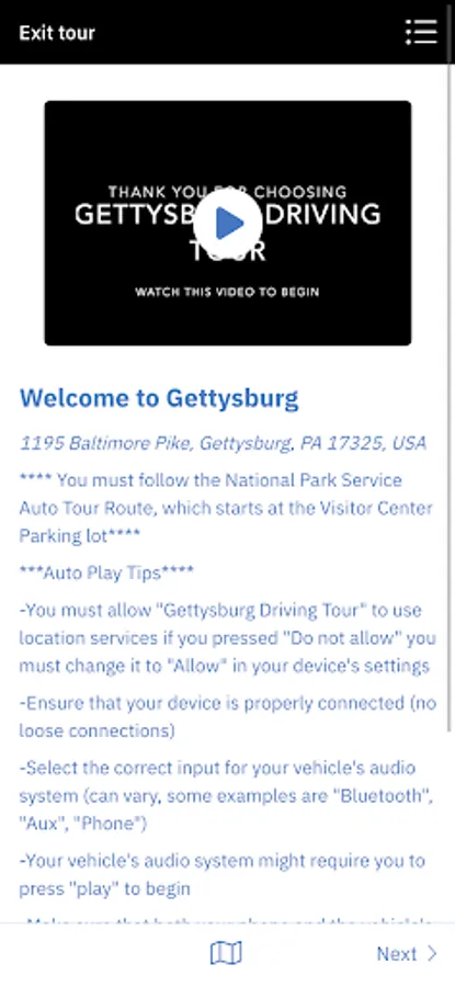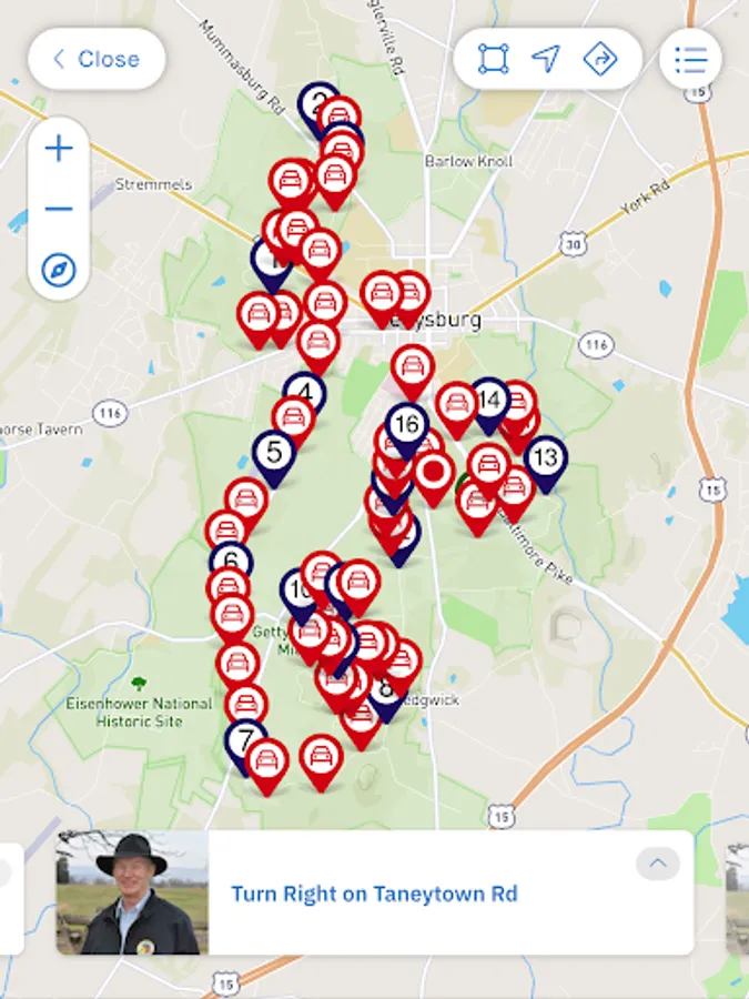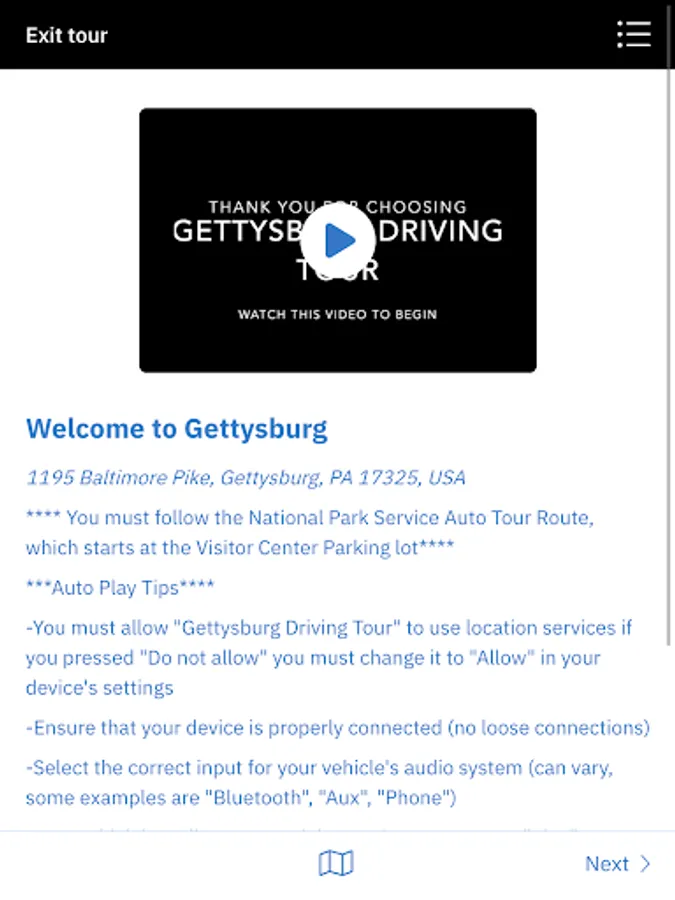 Start your tour of the Gettysburg Battlefields in the Gettysburg National Military Park Visitor Center parking lot. This app is made to accompany the Gettysburg Auto Tour Route, Experience Gettysburg Guidebook, or Experience Gettysburg App Map. You must watch the introduction videos, start at the Visitor Center, and drive to the stops in order.