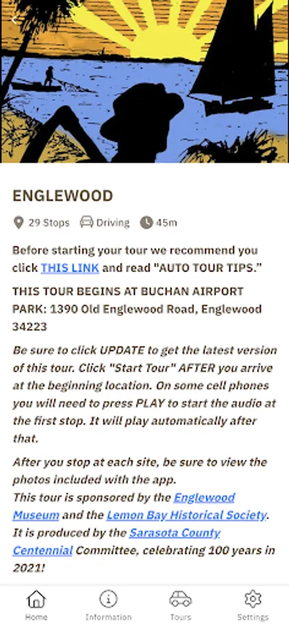 The Sarasota County Centennial Committee is pleased to present this FREE app with newly produced Auto Tours. Explore Sarasota County's notable landmarks and places of interest.
