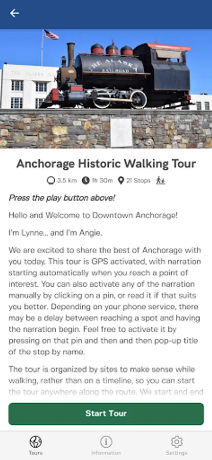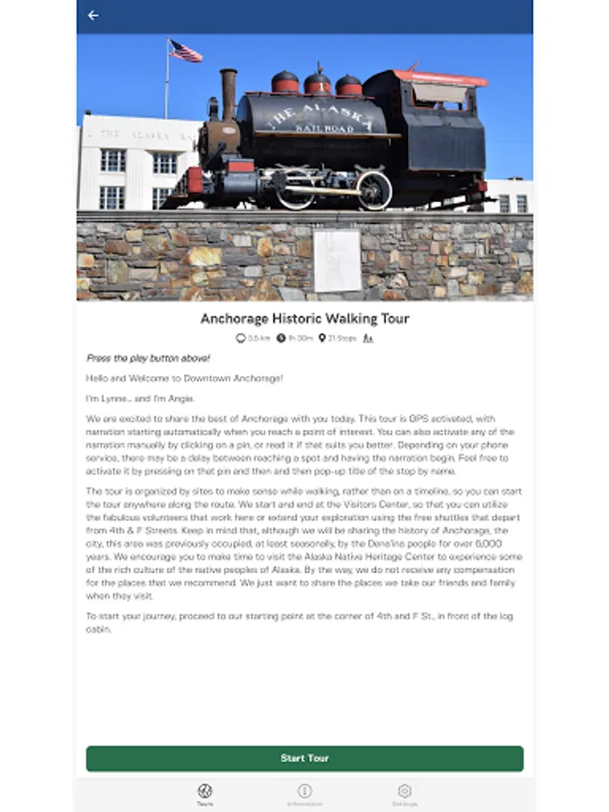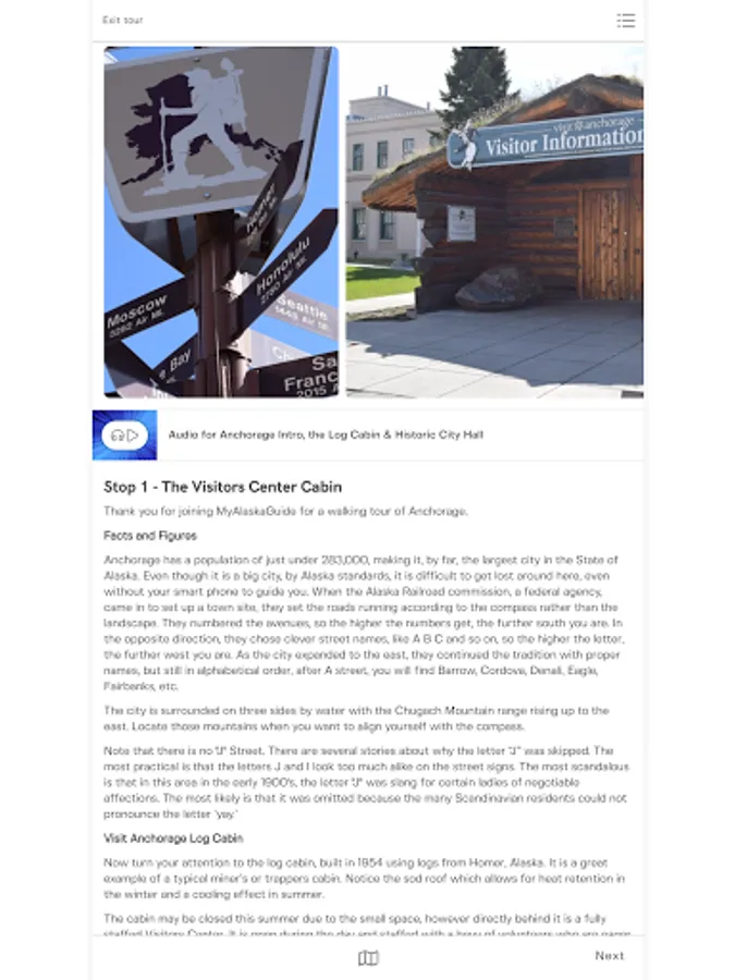 My Alaska Guide is an Audio GPS-activated tours highlighting Alaska's unique history and scenic wonders. Join local tour guides on walking and driving tours throughout Alaska. Learn the stories and events that shaped The Last Frontier. History, personal stories and facts provide an in depth experience to Alaska locals and visitors alike. Free and paid content currently available. Anchorage Historic Walking Tour is a 2 mile, 1.5 hour tour around downtown Anchorage. The Anchorage Art Tour is under construction with free content now available. The Anchorage Down and Dirty explores the dive bars and back street art of Anchorage. New tours being added.