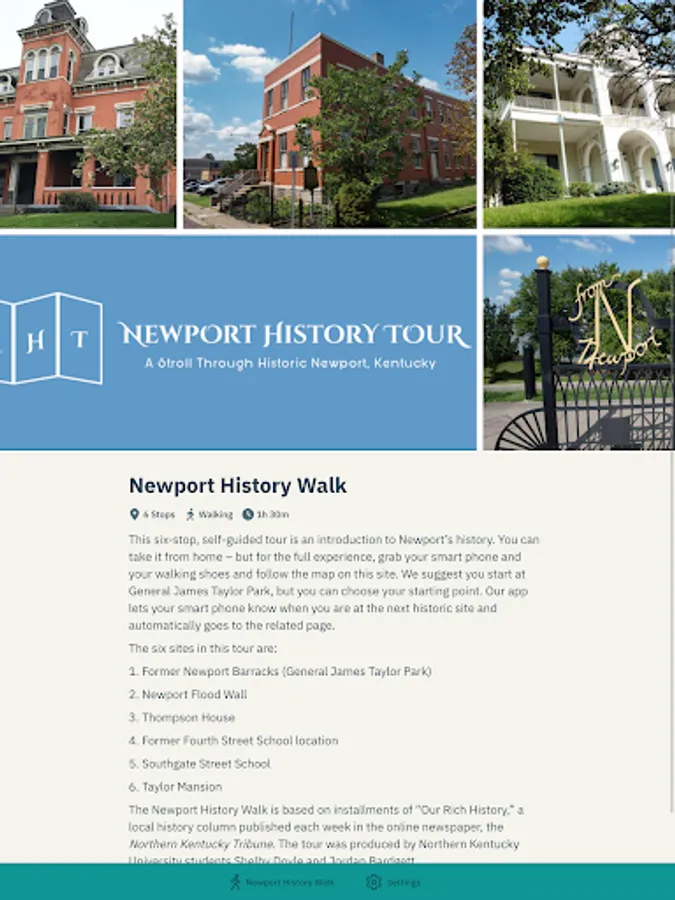 The Newport History Walk is based on installments of "Our Rich History," a local history column published each week in the online newspaper the Northern Kentucky Tribune. The tour was produced by Northern Kentucky University's Scripps Howard Center for Civic Engagement and NorseMedia by student interns Shelby Doyle and Jordan Bardgett.