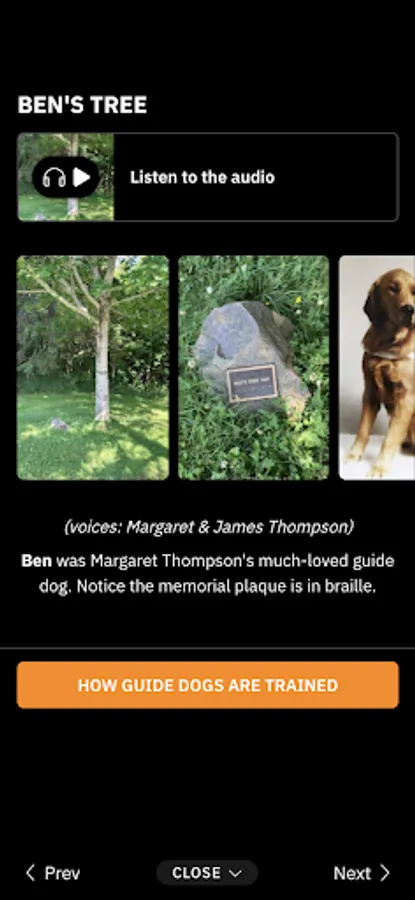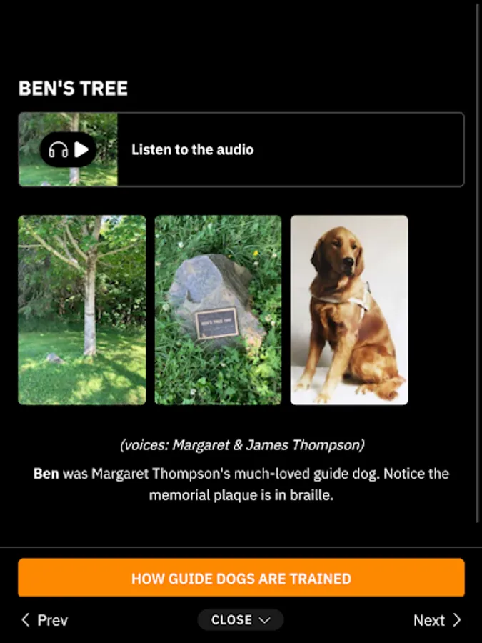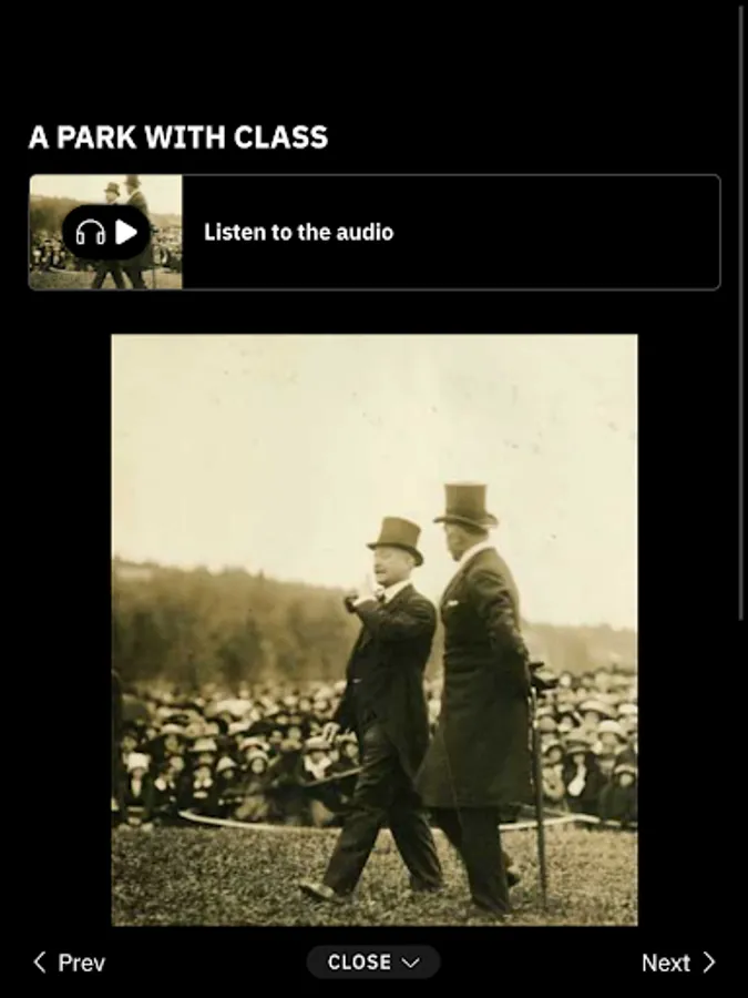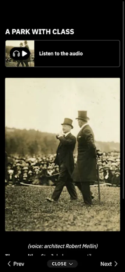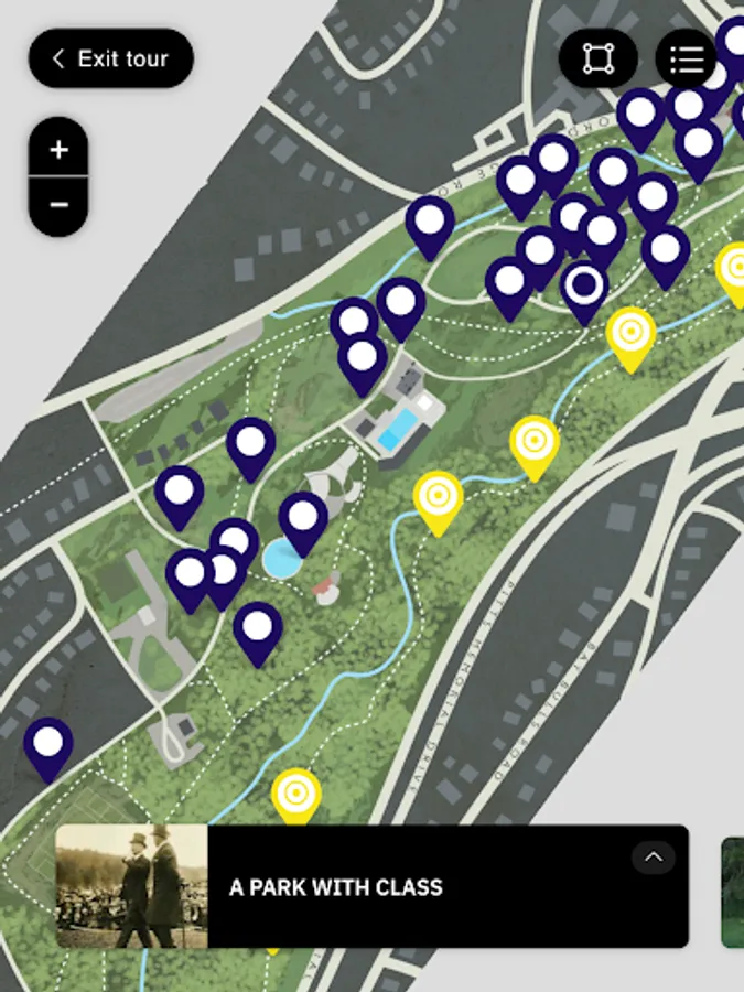 • When you're in the park, the app triggers automatically by GPS as you pass different locations. Voices whisper in your ear, while your smartphone shows photographs, maps and revealing details.