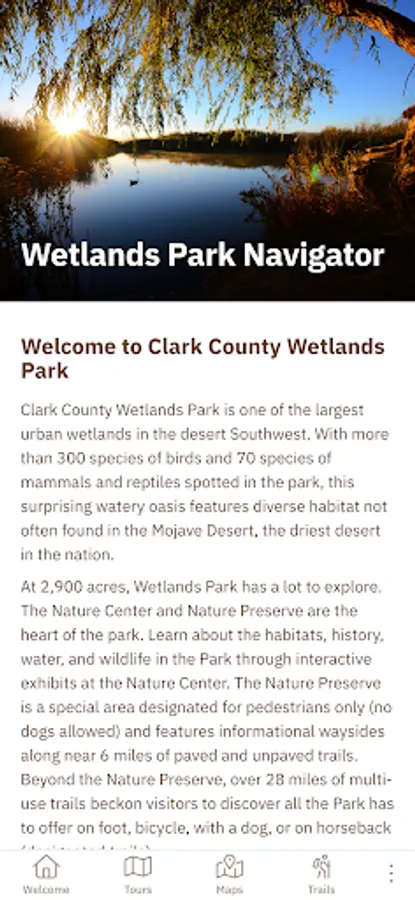 Wetlands Park is a 2,900-acre natural area containing both common and rare habitats in the Mojave Desert, including aquatic wetlands and riparian woodlands. With over 300 species of birds and 70 species of mammals and other wildlife, the Park is a hotspot for birders and animal enthusiasts of all kinds. Over 30 miles of trails for hikers, cyclists, and equestrians crisscross the Park and entice visitors to discover something new about the region. Six trailheads provide access to multi-use trails for hikers, cyclists, and equestrians. Many paved trails are ADA accessible.