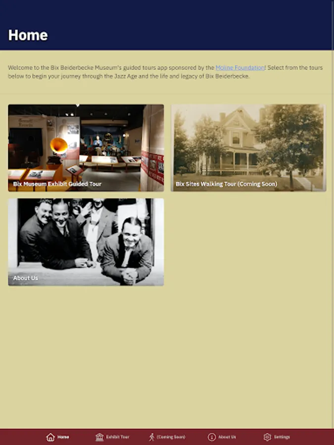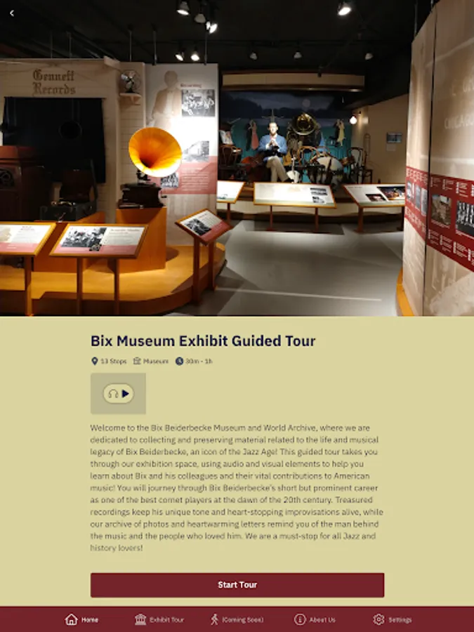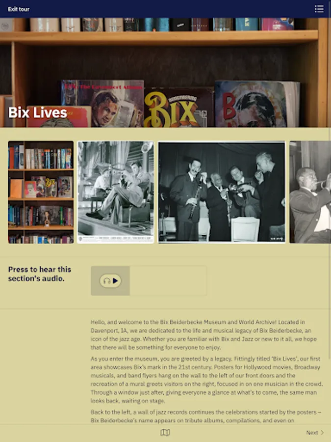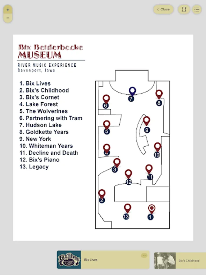 The Bix Museum is a small museum located in Bix Beiderbecke's hometown of Davenport, Iowa. Our museum is a self-guided experience that takes guests 30 minutes to an hour on average. This app provides a guided tour of our exhibit space that features both audio and visual elements to enhance your experience.