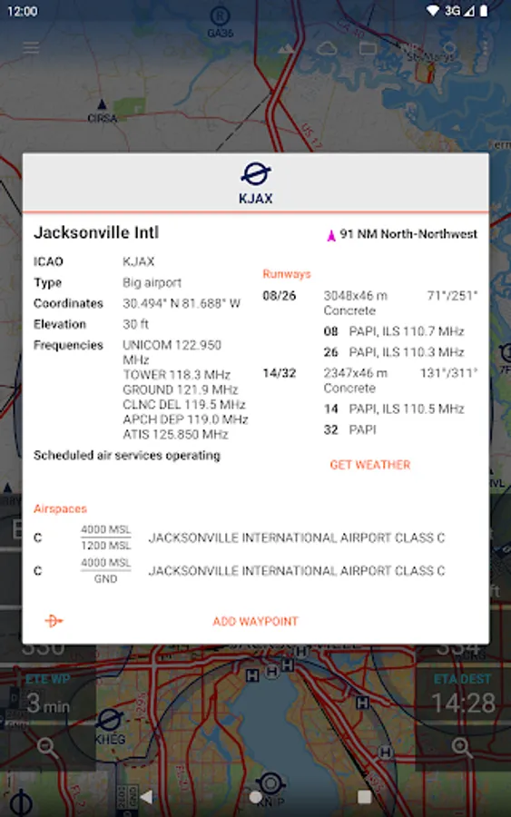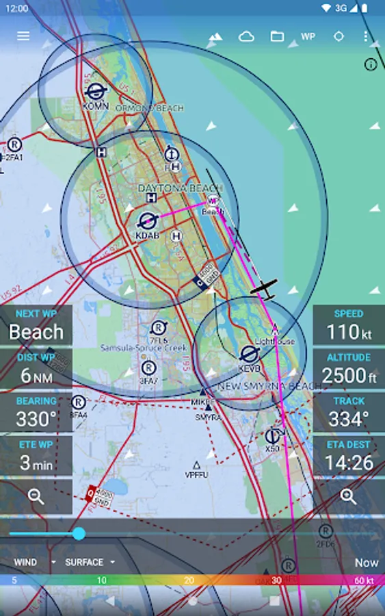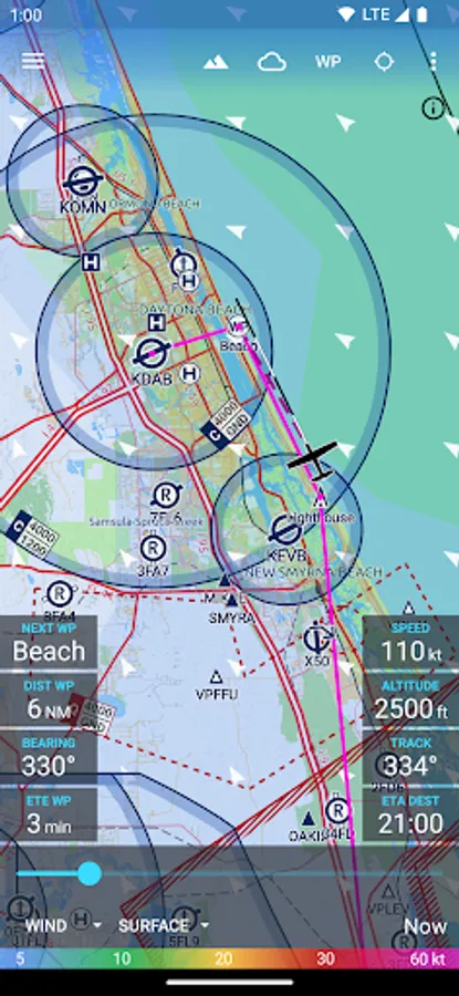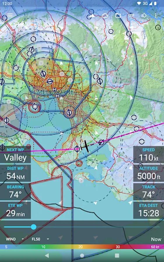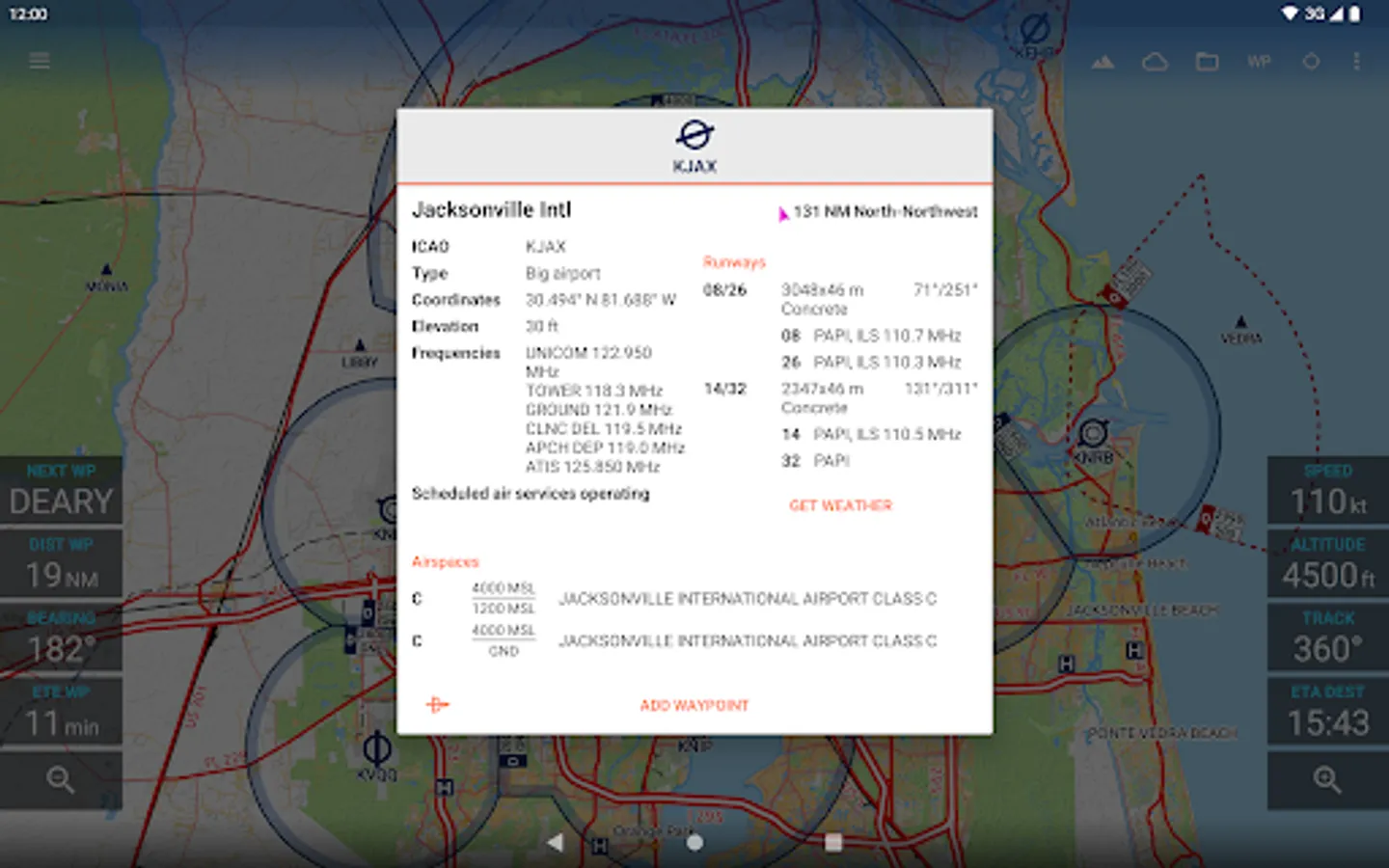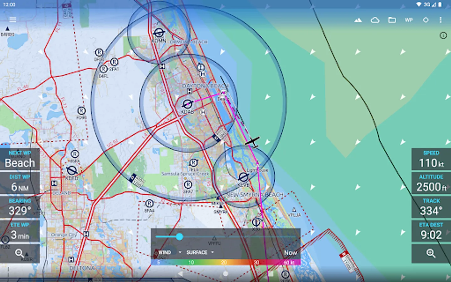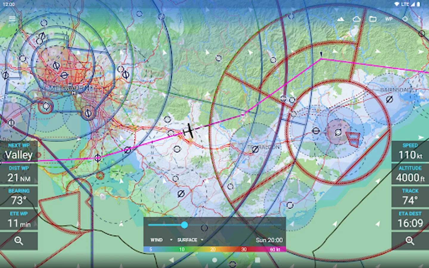 Global, high resolution weather forecasts from the German DWD and US American NOAA provide accurate map layers for cloud cover, ceiling, precipitation, wind on the ground as well as aloft. The data is downloaded onto the device, so you can check the forecast even during flight without cell reception. To retrieve the latest METAR and TAF at your destination airport it is integrated with Avia Weather.