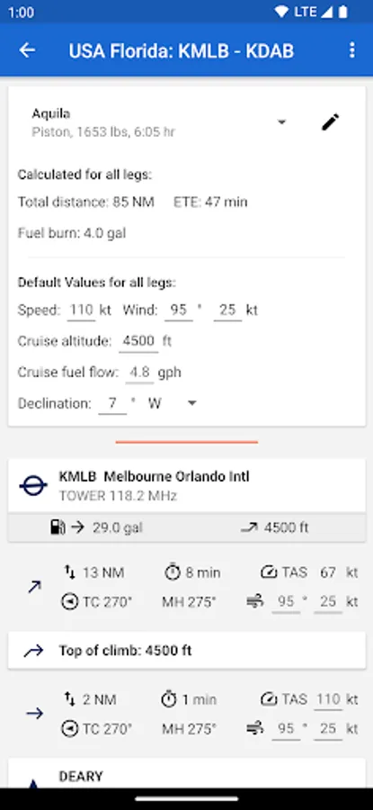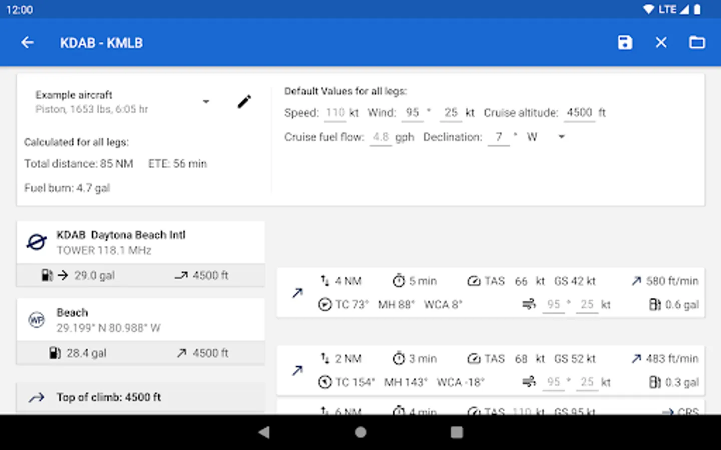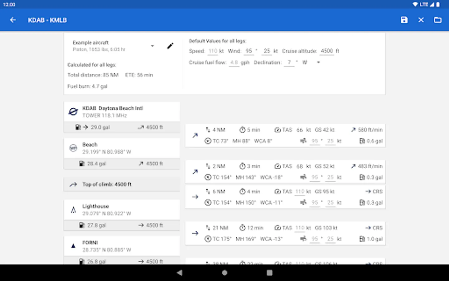 For the most accurate performance calculations you can create multiple aircraft profiles from handbook values for climb performance, fuel consumption etc. Route calculations will use these profiles and even consider engine type and fuel burn for climb performance, employing common formulae used in aerospace engineering. From as little as four carefully chosen data points the app can accurately recreate the climb performance diagram in your POH.