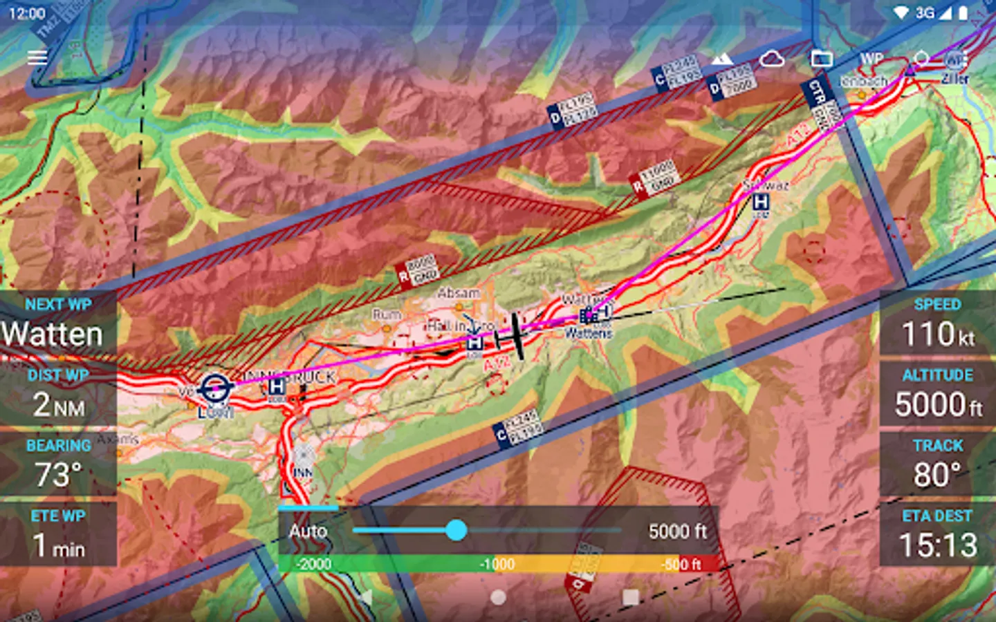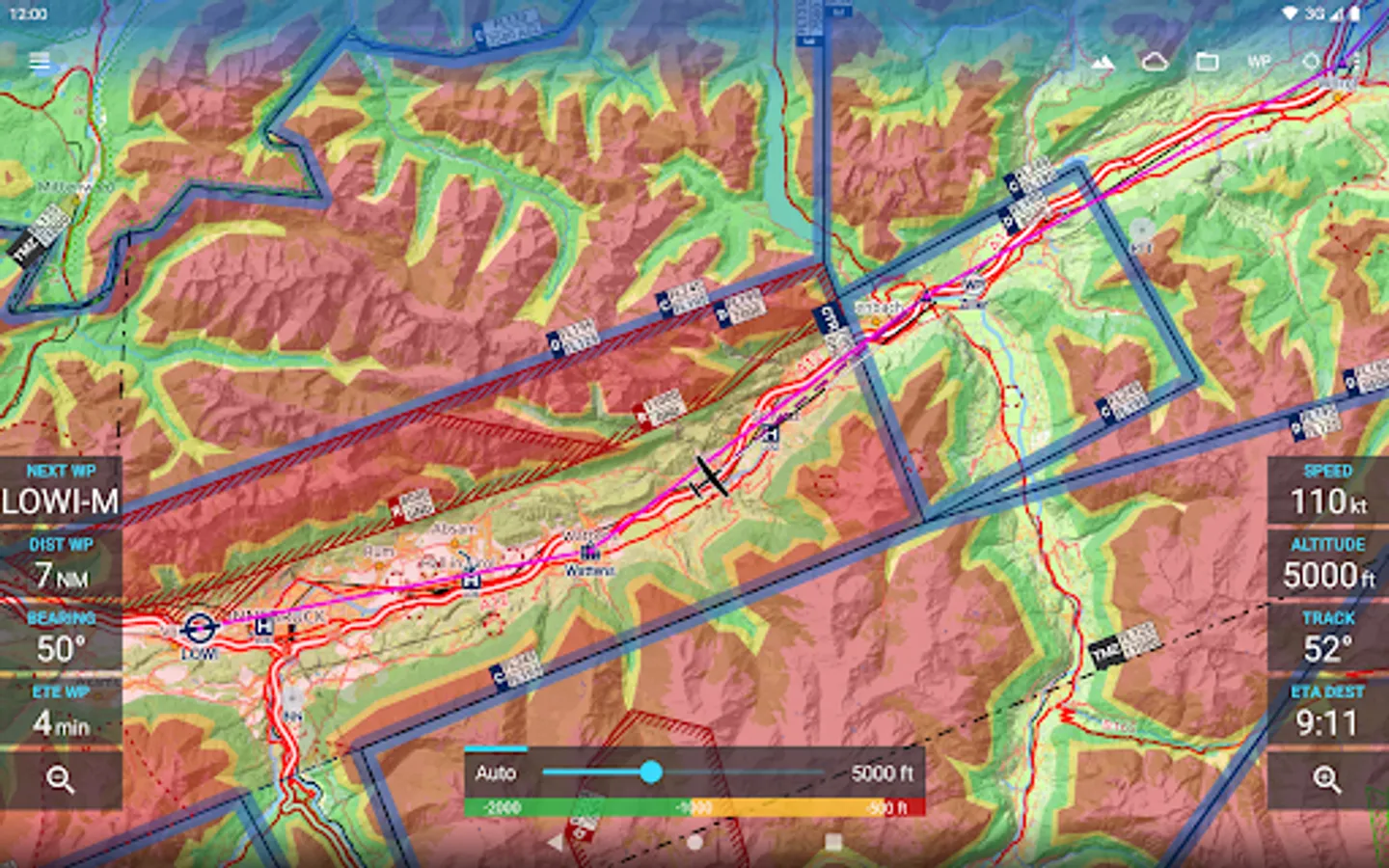A digital elevation model supports you with planning your route in the mountains. During flight the terrain overlay will dynamically color hills and mountains on the map depending on your current altitude to increase your situational awareness.