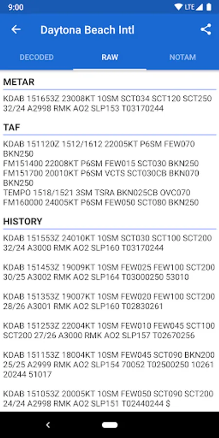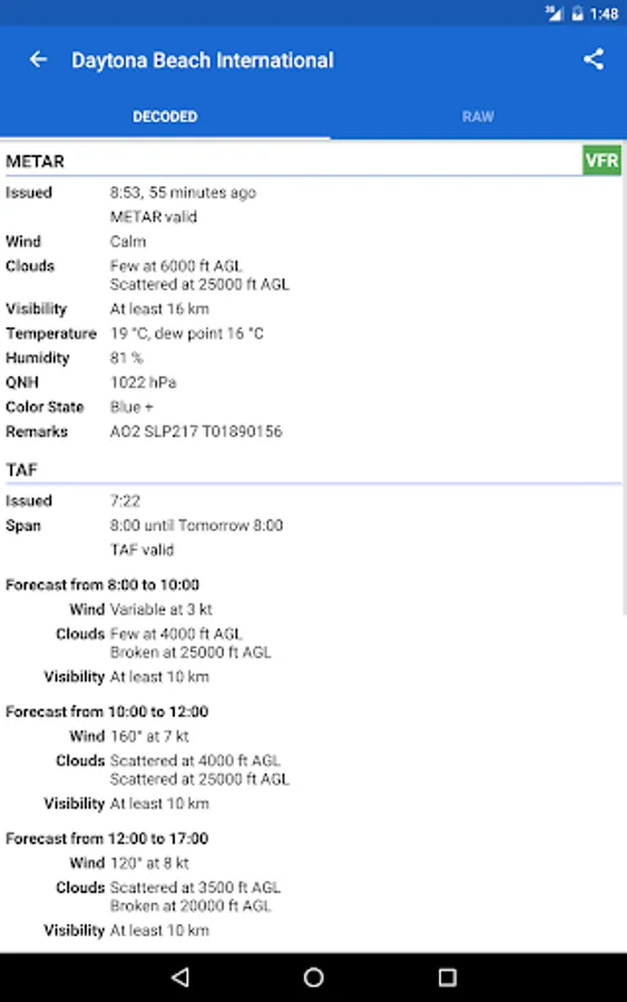 The reliable and straightforward Aviation Weather app for Pilots and aerospace enthusiasts. The METAR-Reader decodes and presents the current METARs of more than 9500 Airports around the globe. Neither more nor less. A simple Color Coding allows a fast classification by VFR or IFR Conditions - as an option even by NATO Color State. Additionally the current TAF weather forecasts are retrieved and displayed clearly in a decoded form.