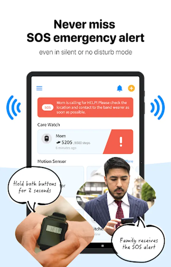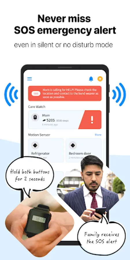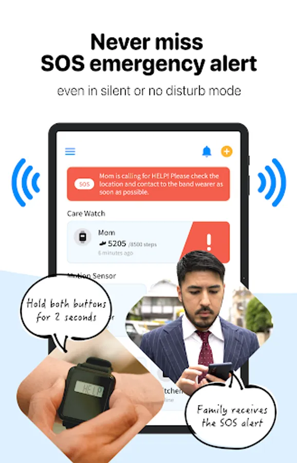 Care Watch user can send an SOS alert when they need help in an emergency situation by simply pressing both Watch buttons for 2 seconds. Then, the family members who have the Tracmo Care App installed and signed in with the same account will get a sound alert and notification.